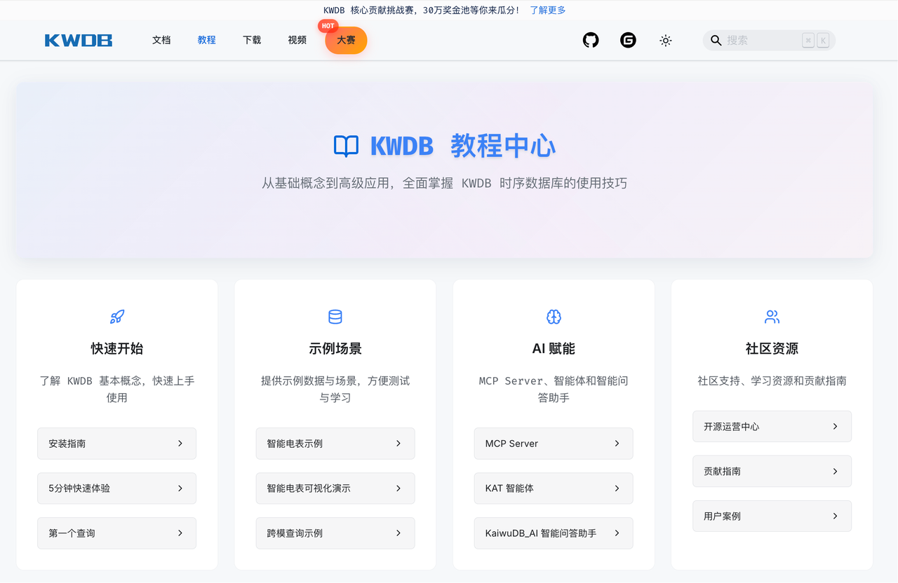 教程中心精心收录并打造 KWDB 全生命周期学习资源矩阵,系统整合上手指南、典型应用案例、AI 适配方案等核心内容。从基础操作入门到复杂场景进阶,以结构化分类体系精准匹配不同阶段开发者需求,构建专业高效的学习生态。
