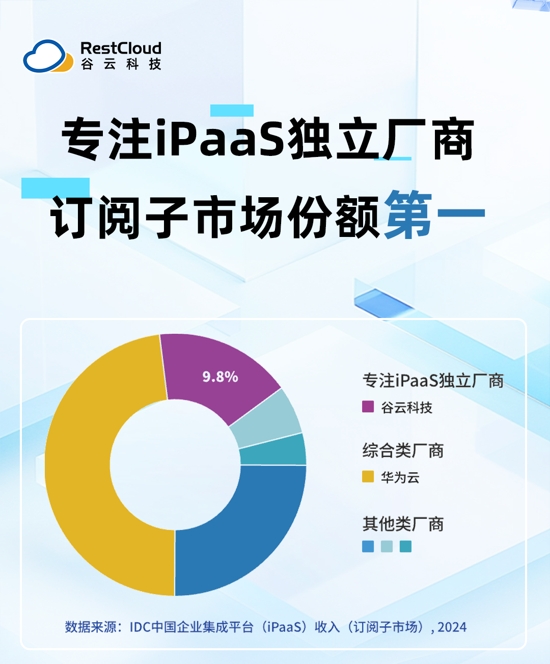 在 IDC《2024 中国企业集成平台(iPaaS)收入报告》中,谷云科技在订阅子市场份额稳居独立厂商第一,整体市场份额全国第二的成绩,稳居行业第一梯队