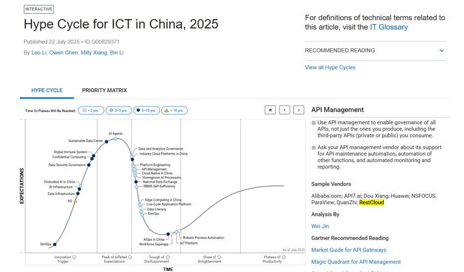 RestCloud iPaaS 入选全球具有权威性机构Gartner《2025中国API管理市场指南》及Gartner《2025中国ICT技术成熟度曲线》报告。
