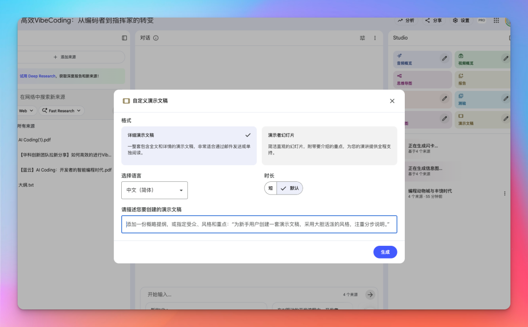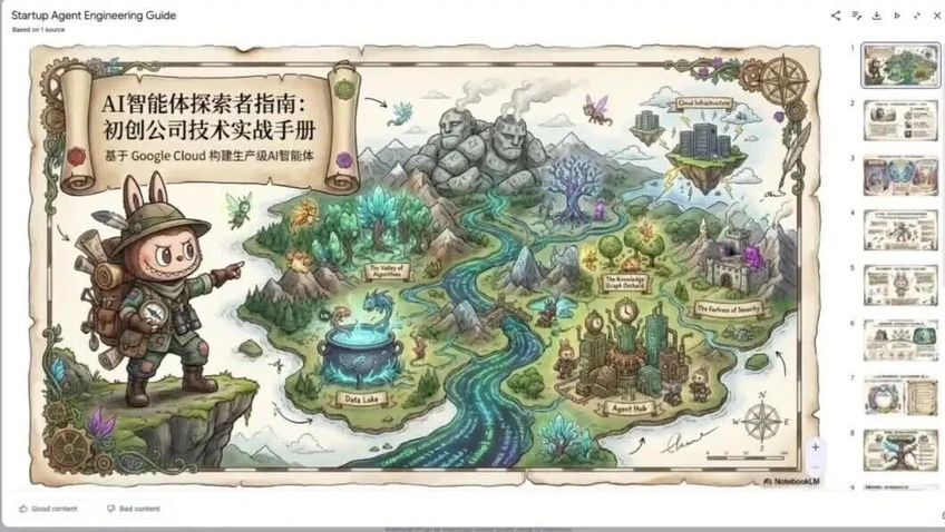 NotebookLM 的底座用的就是谷歌自己的 Gemini,现在集成了 Nano Banana Pro,可以说是直接原地起飞,基于知识库直接做 PPT。