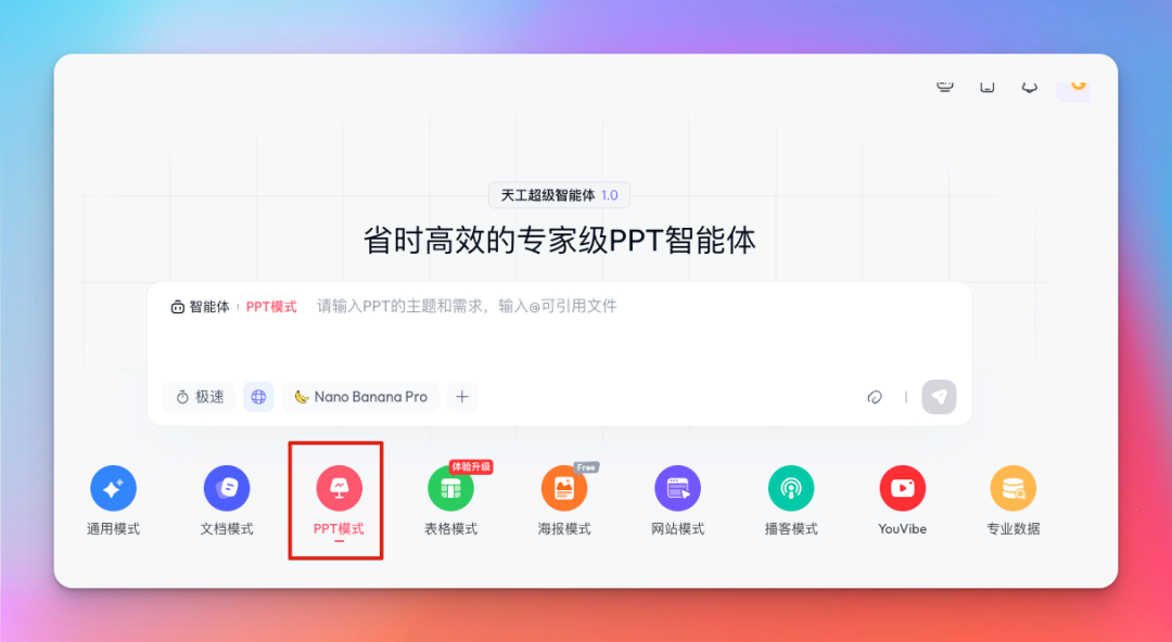 在这个地方打开 PPT 模式,然后输入自己的需求,等待着生成。