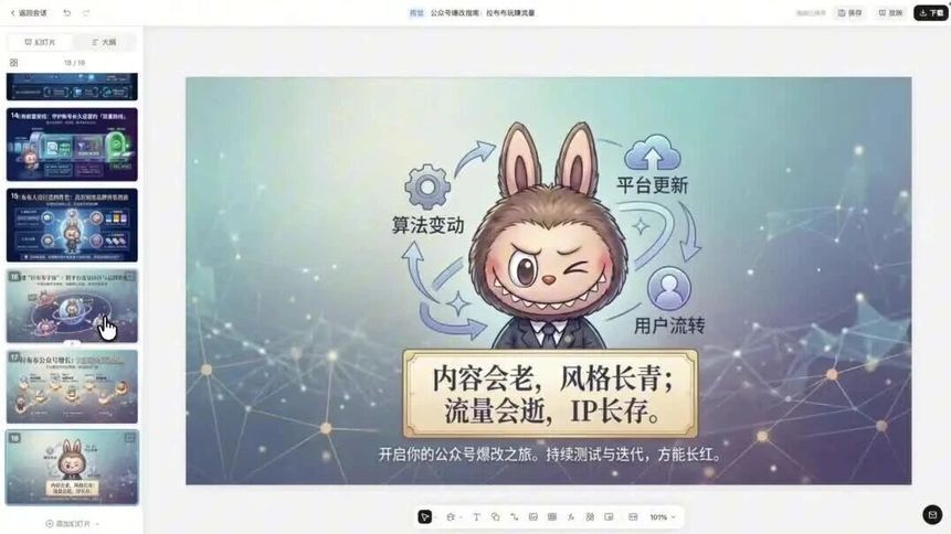 同样支持通过附件来转 PPT,比如我上传了我分享的《公众号流量玄学》这个 pdf 资料,然后淡定的输入以下提示词: