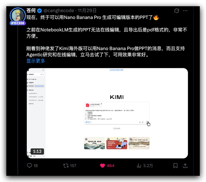 不瞒你说,最近刷 X,看到 Kimi 在国际版偷偷上线了基于 Nano Banana Pro 的 PPT 模式,还能直接在线编辑。