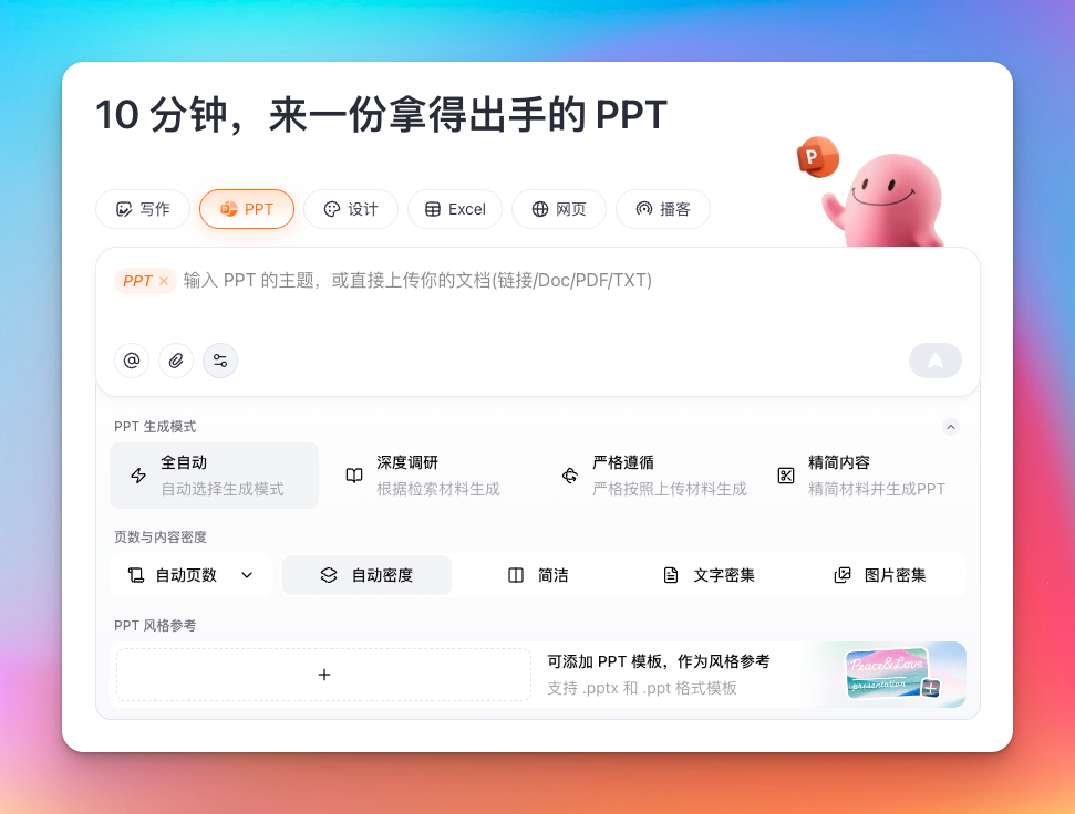 字节旗下的通用 Agent 产品,在 PPT 创作上也有两把刷子。直接打开 PPT 模式: