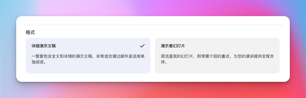 格式的话一共分 2 种,分别是详细演示文档和演示者幻灯片。