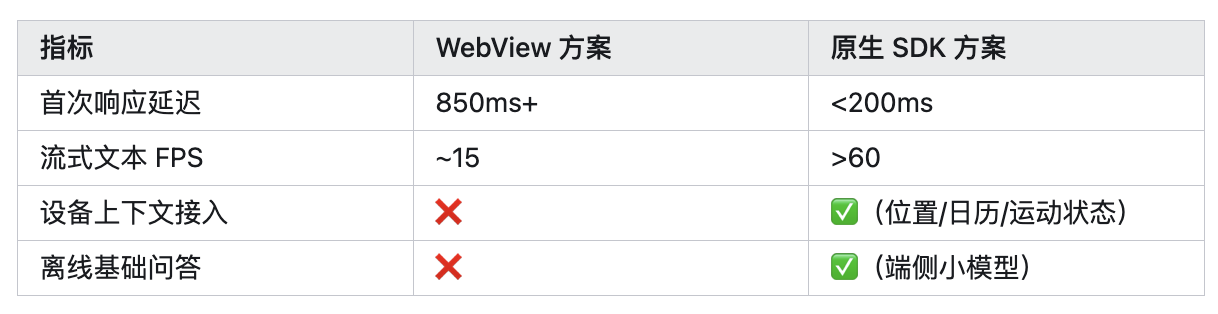 很多团队尝试用 WebView 嵌入 Chatbot 来实现对话功能。但很快发现几个致命问题: