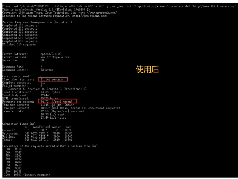 使用了消息队列后,同样 610 的并发,使用时间就缩短了