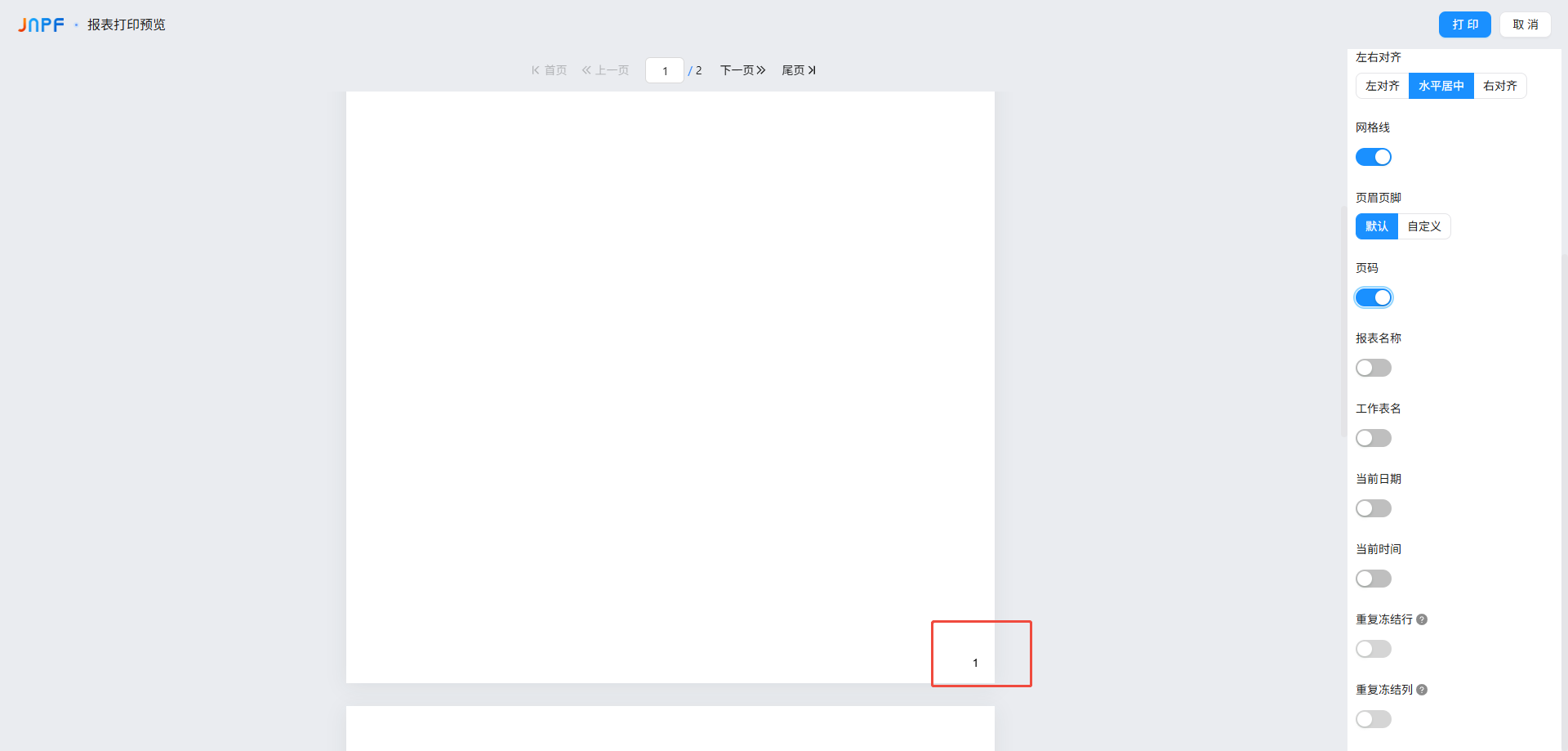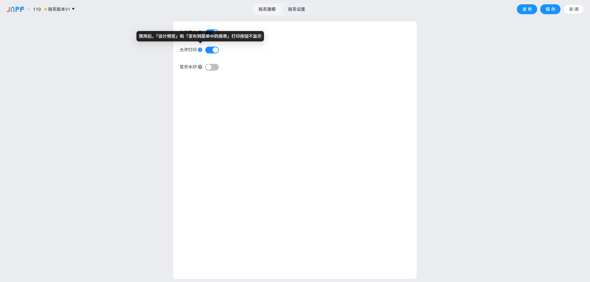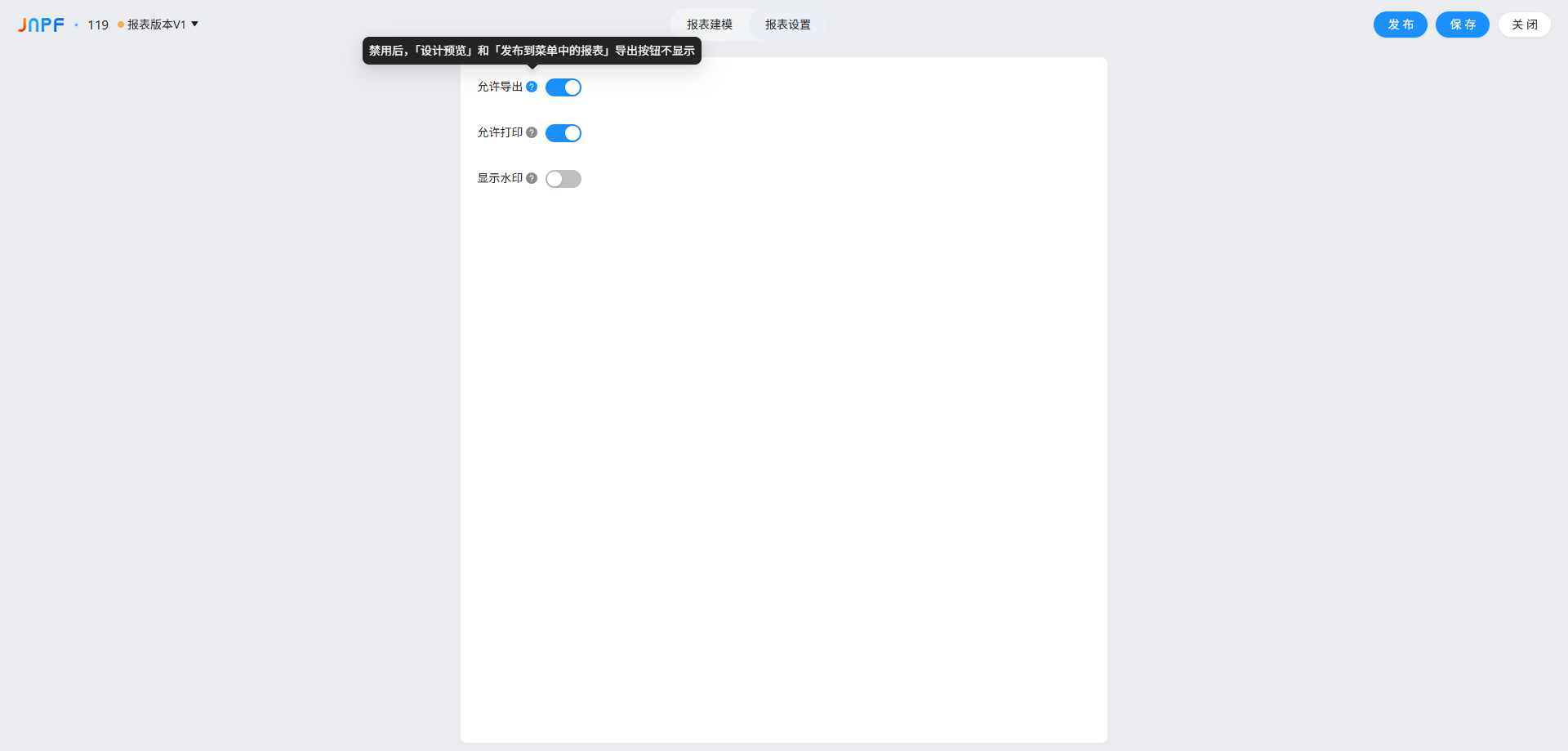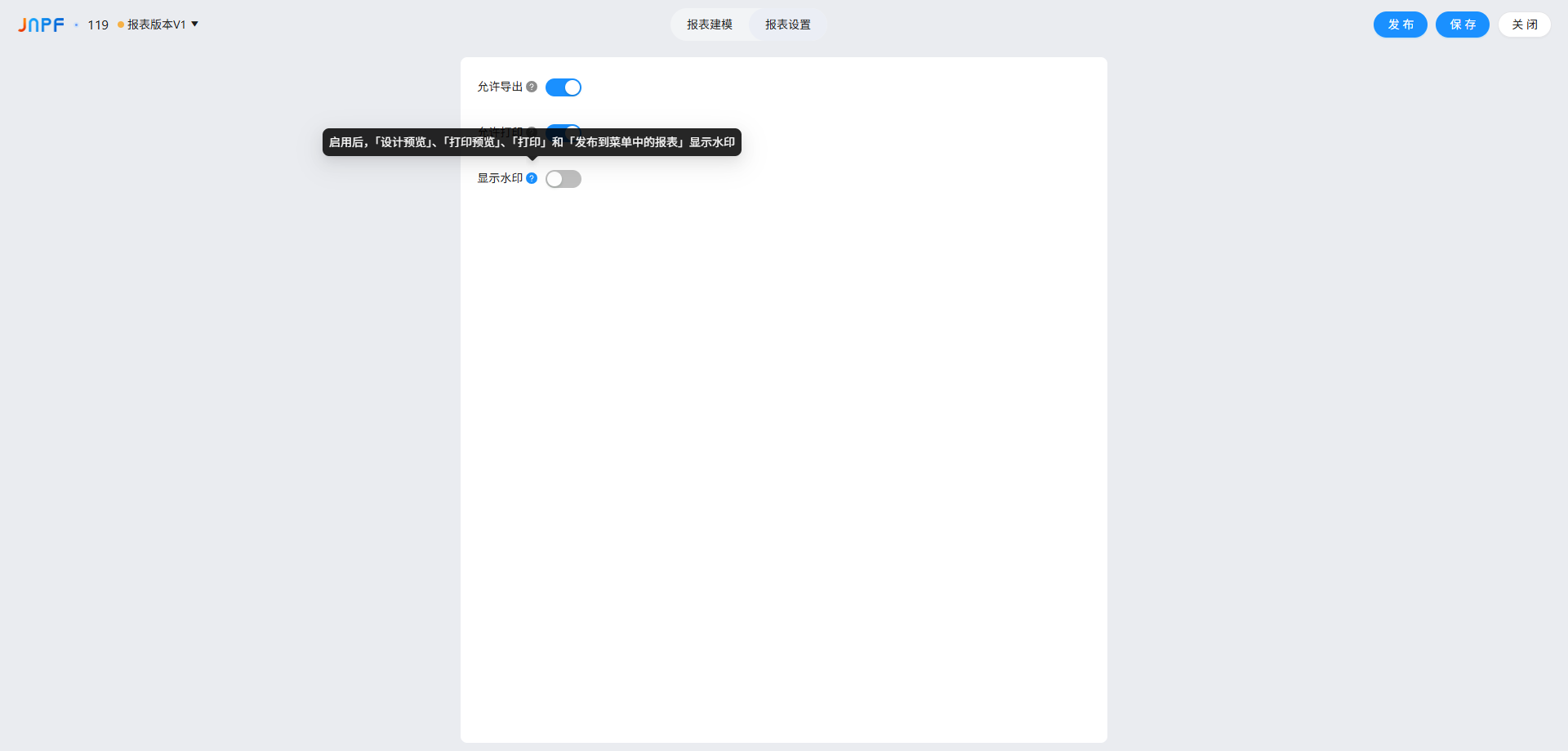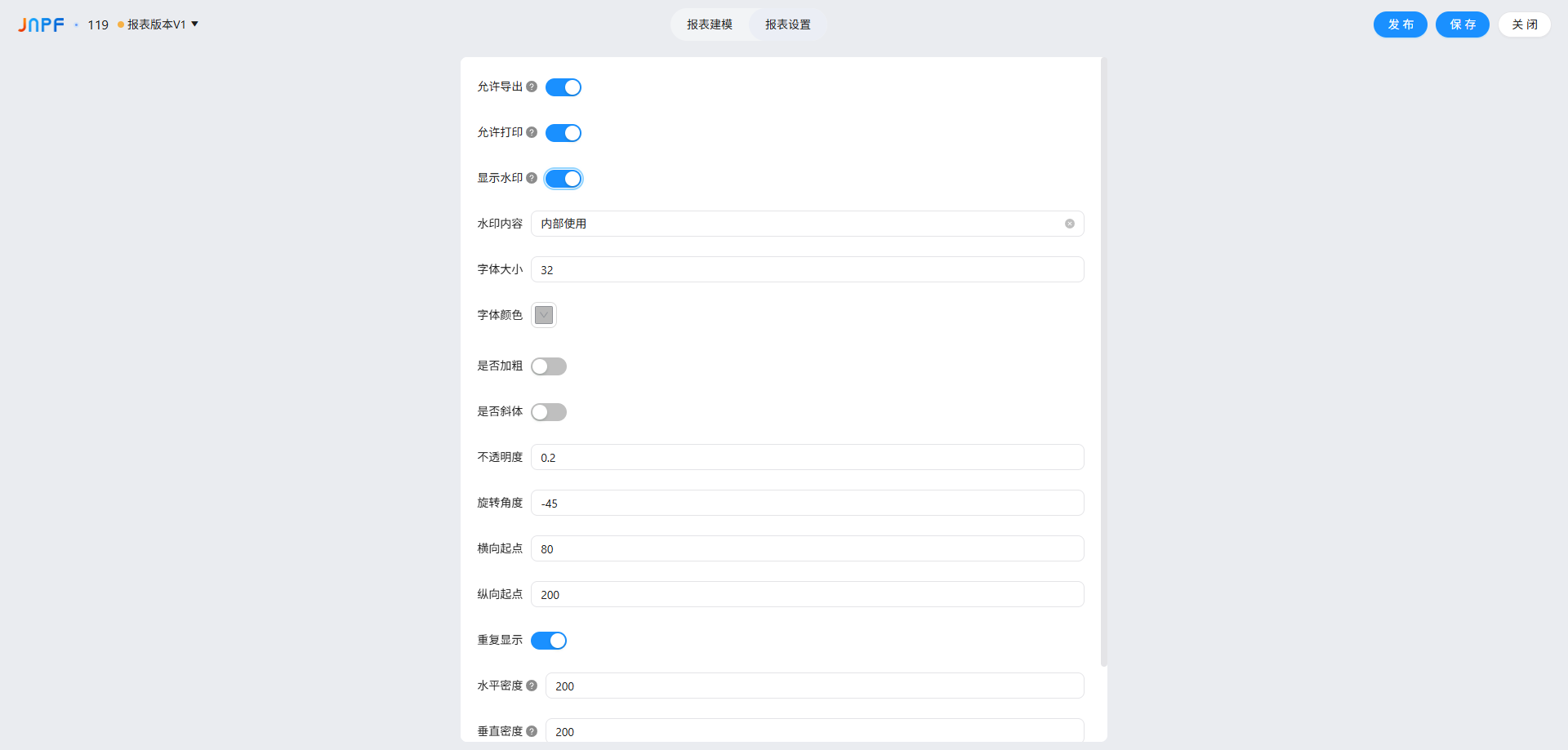 可设置报表是否启用导出、打印按钮及是否展示水印,预览页面及发布成菜单页面均生效