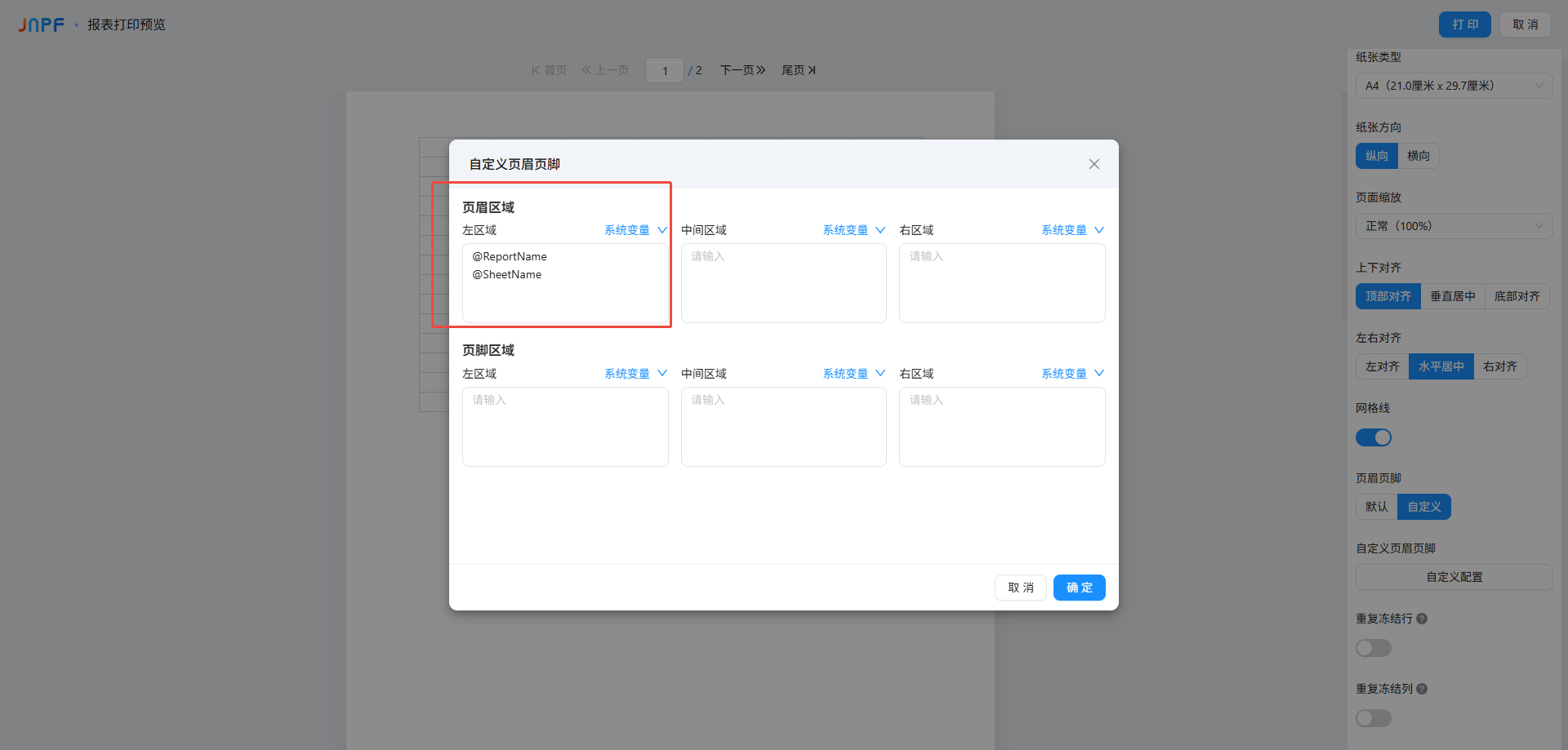 点击预览,展示报表保存的设计;展示导出、打印按钮【报表设置未修改时默认展示】