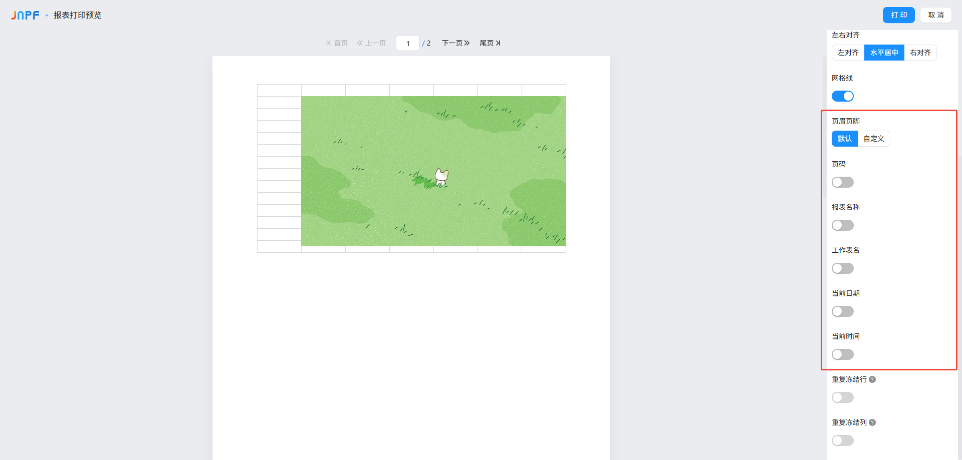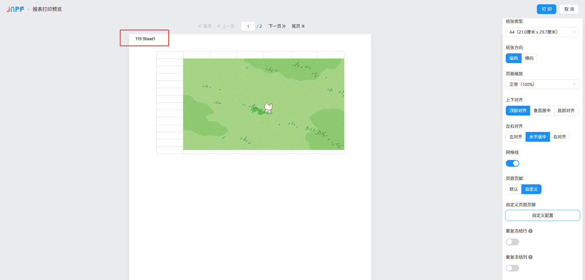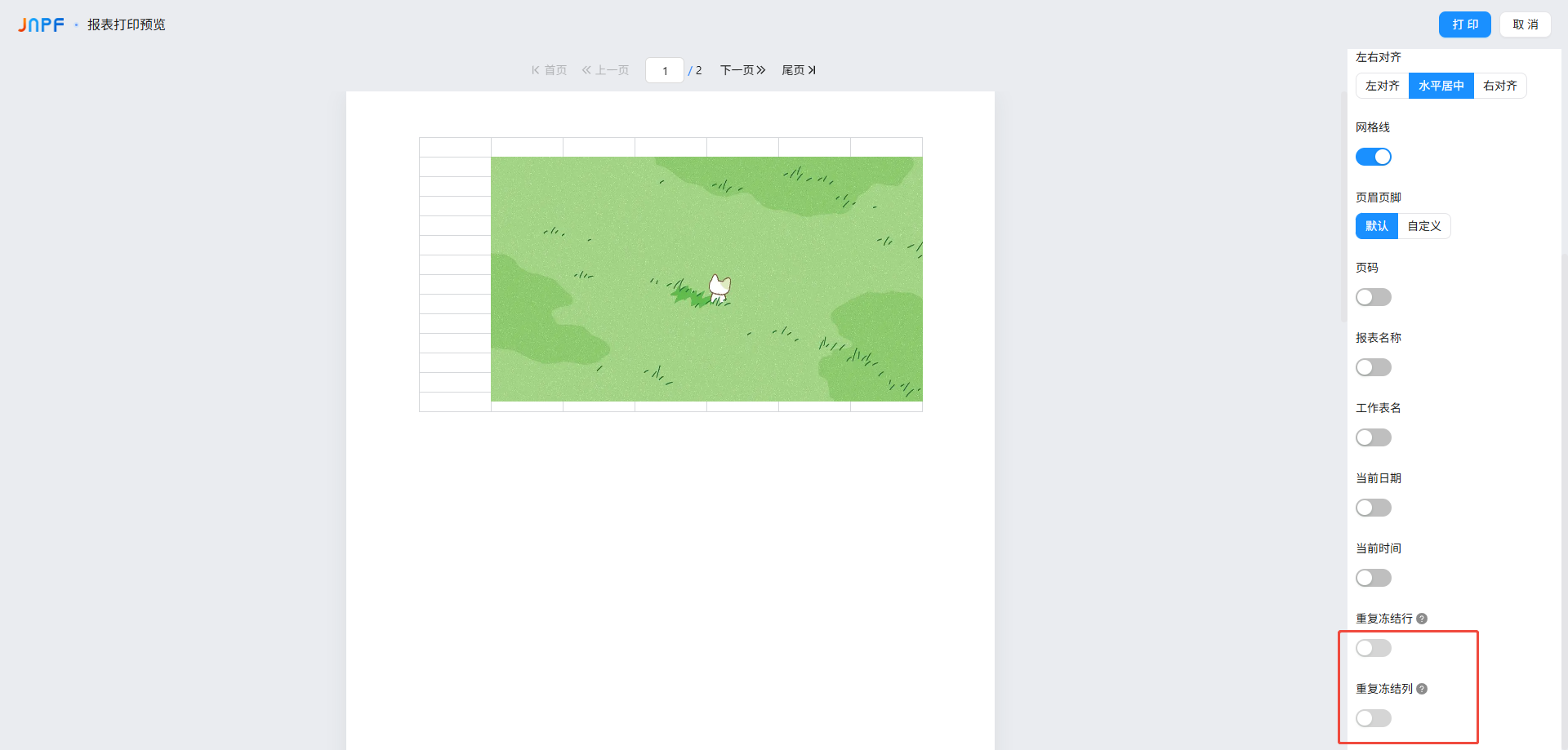 重复冻结行设计页面无冻结行,打印属性不可配置重复冻结行 ;设计页面有冻结时,支持 启用(冻结后默认启用)或 禁用,当启用时,打印存在跨页时每个页面都显示冻结区域内容,当禁用时,报表原样显示;例:A2 位冻结,当列数未超过页数列时,冻结后每一页都显示第一行内容;当超过页数列时,冻结后优先把每列显示(如第一页显示 1-7 列、第二页 8-14 列,依此类推),其次,显示冻结的第一行,其余数据在其后显示内容