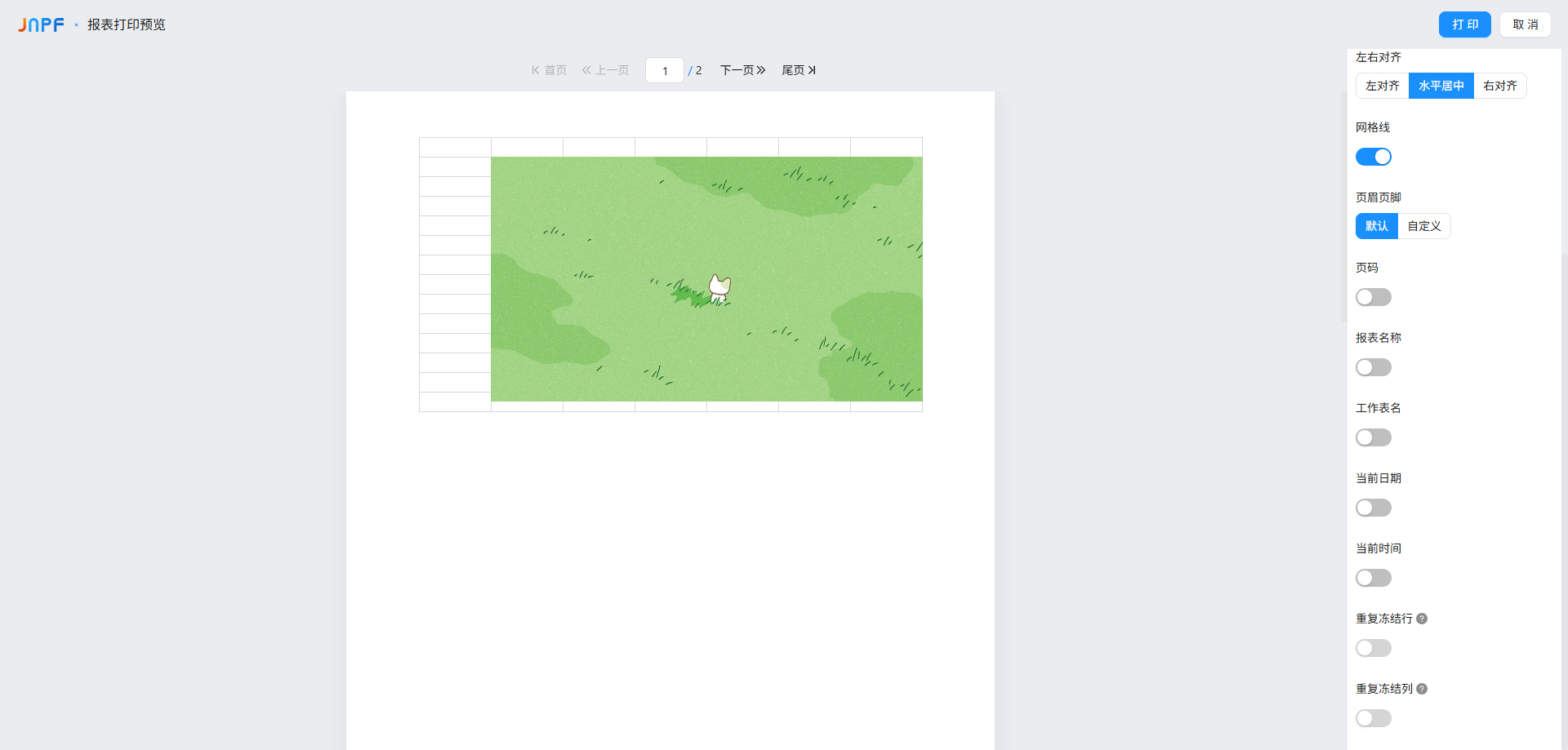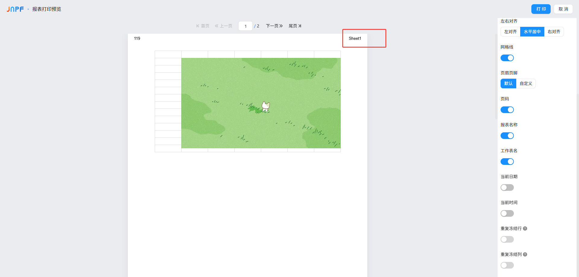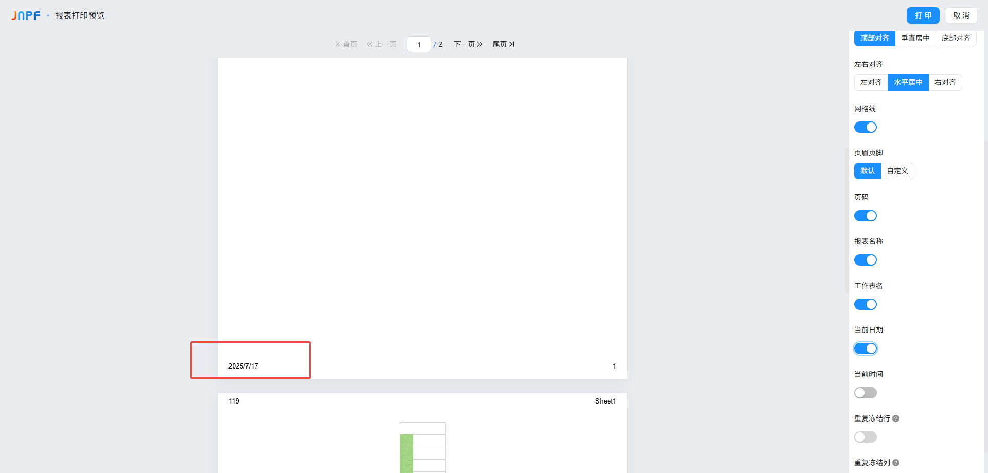 重复冻结行设计页面无冻结行,打印属性不可配置重复冻结行 ;设计页面有冻结时,支持 启用(冻结后默认启用)或 禁用,当启用时,打印存在跨页时每个页面都显示冻结区域内容,当禁用时,报表原样显示;例:A2 位冻结,当列数未超过页数列时,冻结后每一页都显示第一行内容;当超过页数列时,冻结后优先把每列显示(如第一页显示 1-7 列、第二页 8-14 列,依此类推),其次,显示冻结的第一行,其余数据在其后显示内容