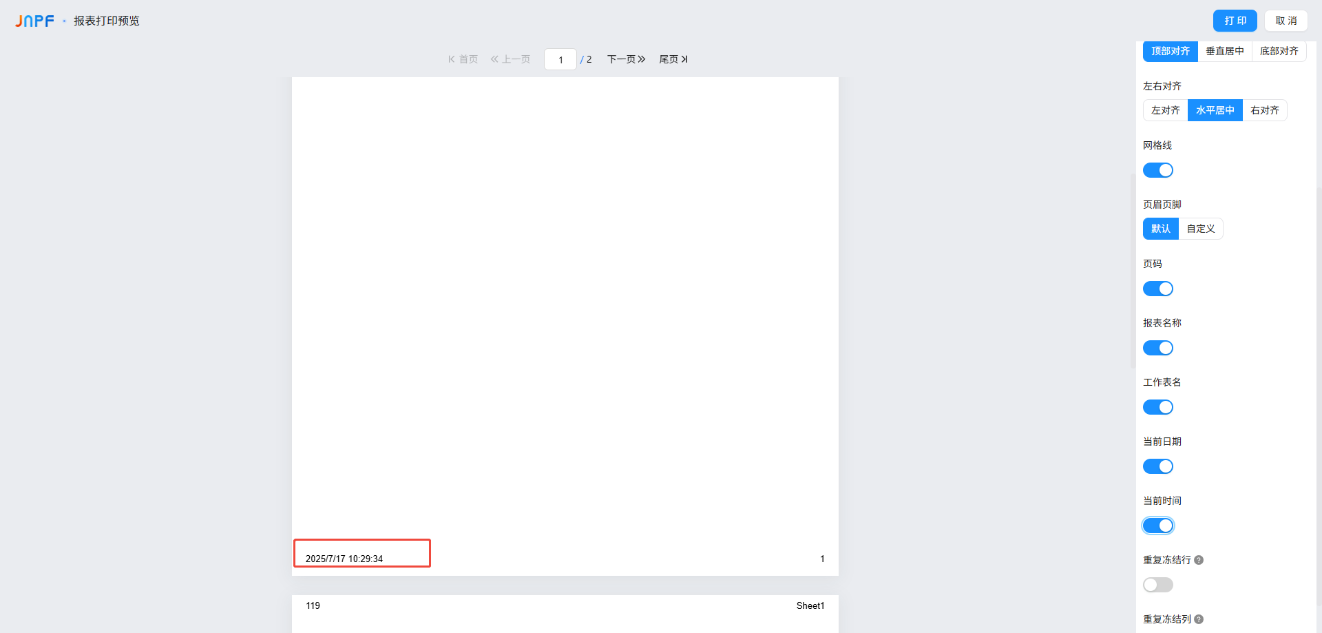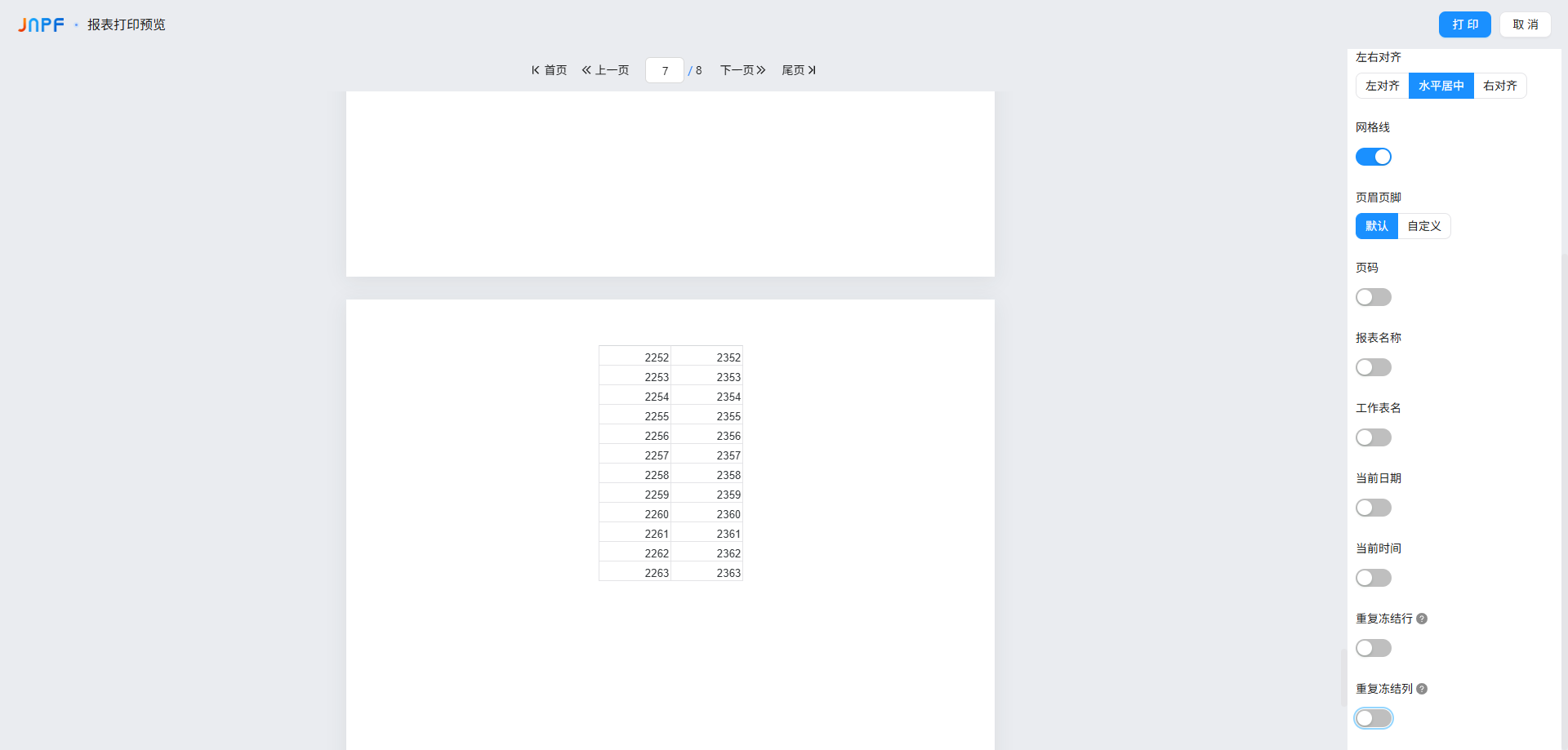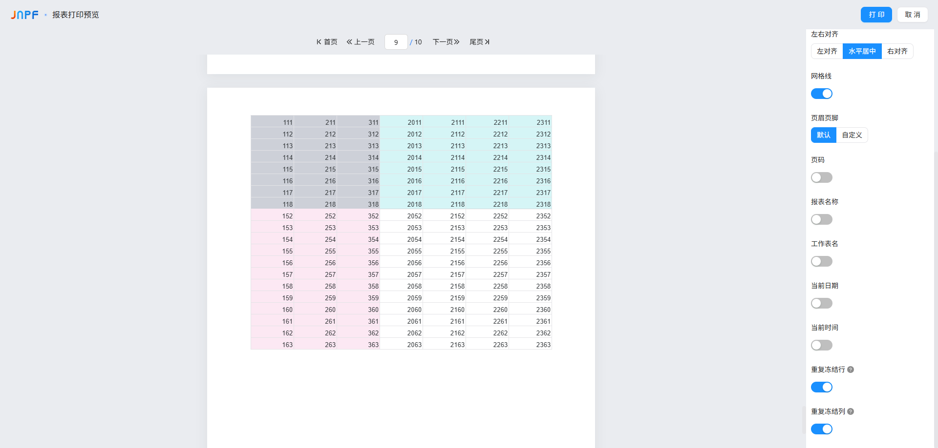 重复冻结列设计页面无无冻结列,打印属性 不可配置 重复冻结列 ;设计页面有冻结时, 支持 启用(冻结后默认启用) 或 禁用,当启用时,打印存在跨页时每个页面都显示冻结区域内容,当禁用时,报表原样显示;例:B1 单元格冻结,当列数未超过页数列时,冻结后每一页都显示第一列内容;当超过页数列时,显示冻结的第一列,冻结后优先把每列显示(如第一页显示 1-7 列、第二页第 1 列、8-13 列,依此类推),其次,显示冻结的第一列,其余数据在其后显示内容