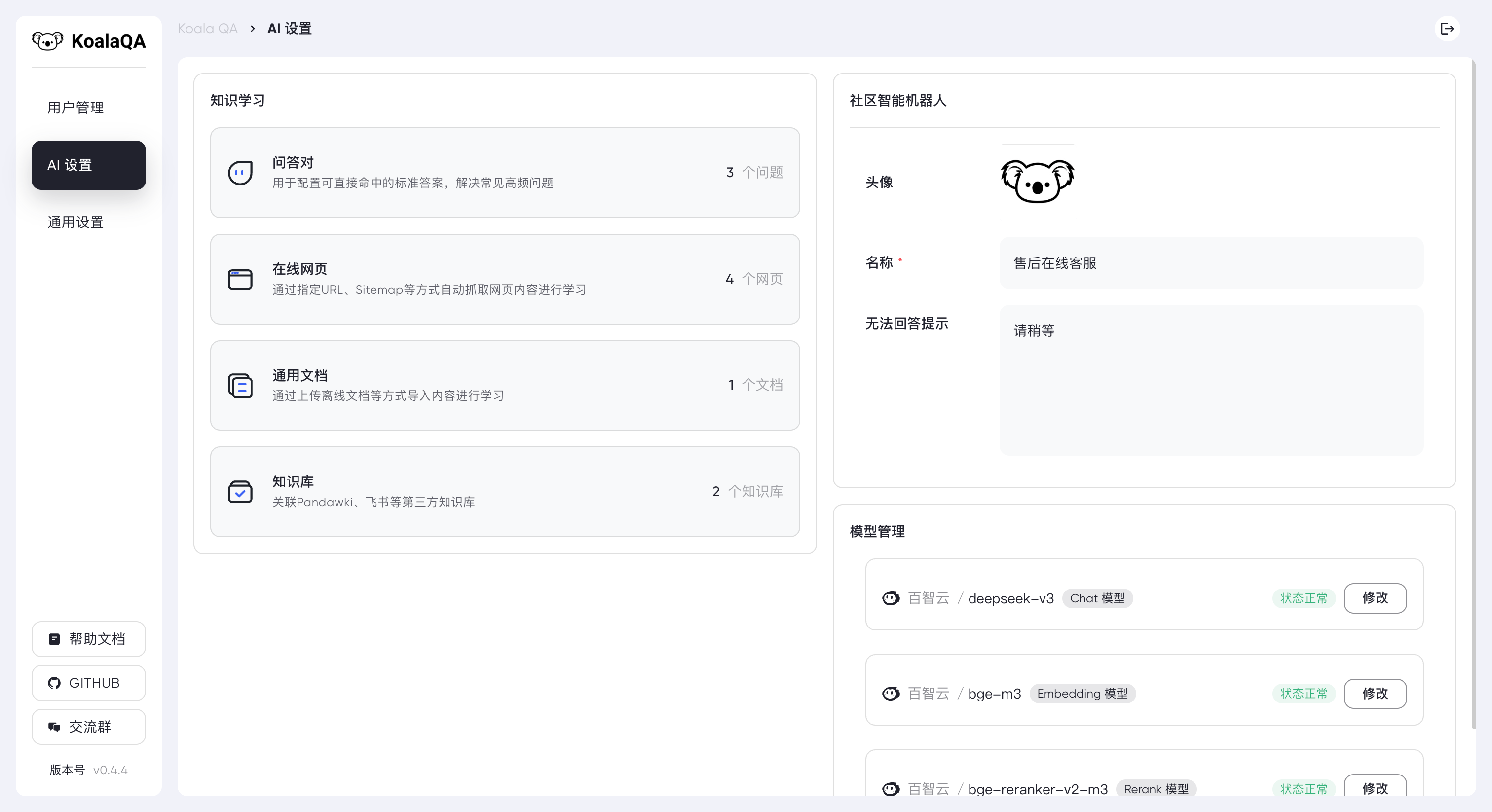 KoalaQA 的 AI 客服会实时解答用户问题,这些互动对话形成了最鲜活的知识素材库。系统会自动标记高频问题和优质回答,为后续知识生产打下基础。