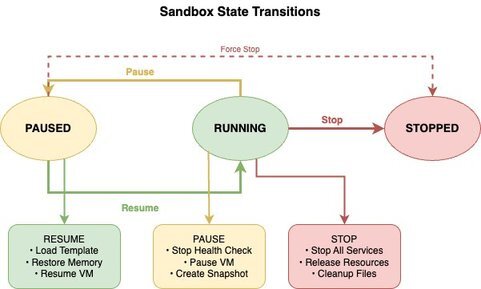 (1) 资源利用效率: 传统容器/虚拟机持续占用资源容易造成浪费,而通过暂停机制可实现按需资源分配。处于 PAUSED 状态时,系统能释放 CPU 和大部分内存资源,并可根据需求快速恢复,有效避免资源的长期占用,从而支持高密度沙盒部署。