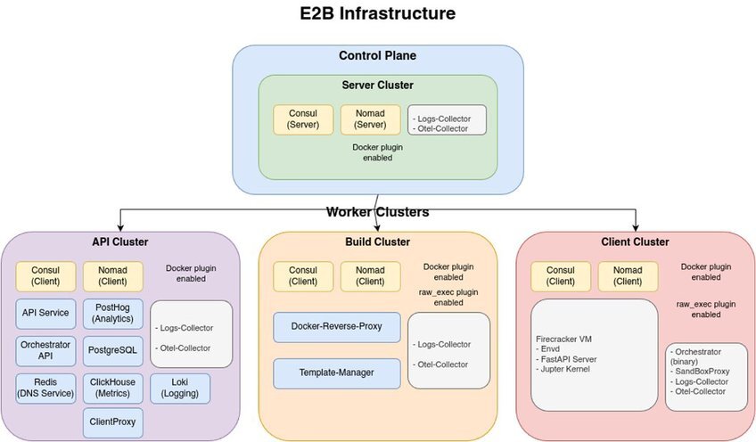 Server Cluster(服务集群):E2B 集群的控制面,底层基于 Consul 和 Nomad 管理整个集群的基础设施和服务组件。负责服务发现、配置管理和集群协调,确保整个系统的高可用性和一致性。