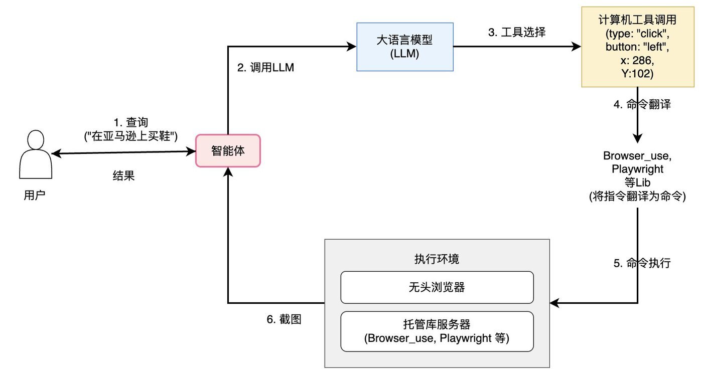 除了代码执行,Agent 应用的另一个重要应用场景是 Computer Use(计算机使用)和 Browser Use(浏览器使用)。Computer Use 是指 AI Agent 能够像人类用户一样操作计算机界面,包括点击按钮、输入文本、拖拽文件等各种 GUI 操作。Browser Use 则是 Computer Use 的重要场景,专门指 Agent 在浏览器环境中的自动化操作能力,如网页浏览、表单填写、数据抓取等。