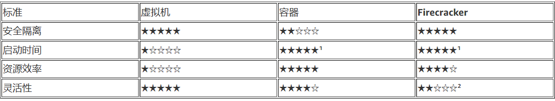以下是不同虚拟化技术能力的对比,可以看到以 Firecracker 为代表的微虚拟化技术提供了强隔离和快速启动时间,非常适合临时启用沙盒的场景: