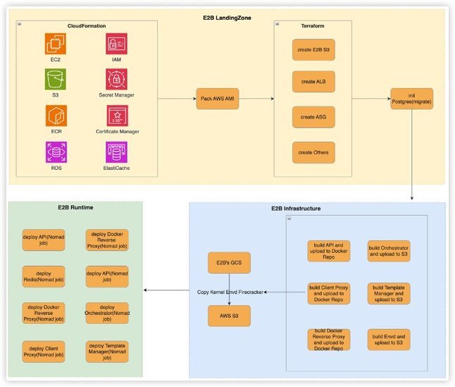 为了简化 E2B 官方的复杂部署流程,我们将 E2B on 亚马逊云科技的部署重构为下述 3 大核心部分: