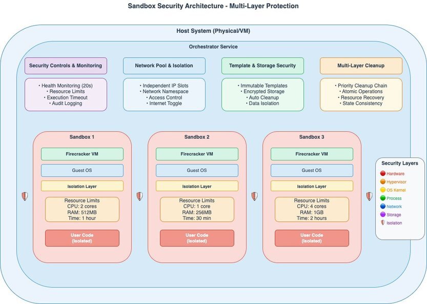 由于 Agent 需要执行外部生成的代码并访问第三方数据,安全风险显著增加。系统必须提供严格的安全隔离和故障隔离能力,确保有害代码不会在不同用户之间产生影响。现代 Agent 要求沙盒环境具备硬件级隔离、系统调用最小化、网络和文件系统的精细权限控制等多层安全防护机制。每个沙盒环境必须完全独立运行,实现真正的故障边界隔离,即使 Agent 生成的代码存在问题,也不应影响其他沙盒节点的正常运行。系统需要确保不同沙盒之间不会相互影响,同时支持高密度部署以充分利用物理机资源,在安全性和性能之间找到最佳平衡点。