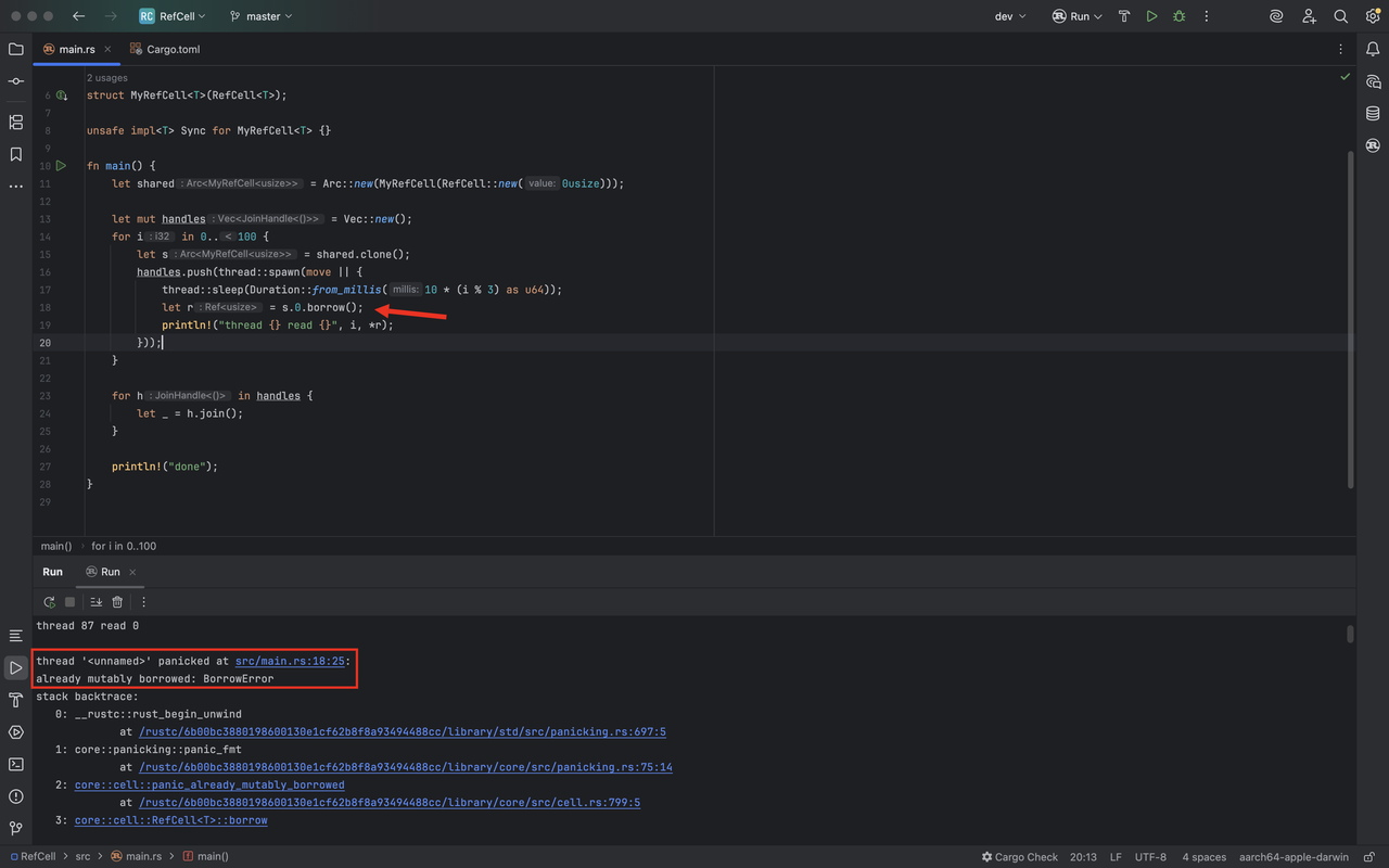 原因在于 RefCell borrow() 的底层实现不是原子的,看着是多线程读,其实内部存在写操作,变成了隐藏的多线程写,如下: