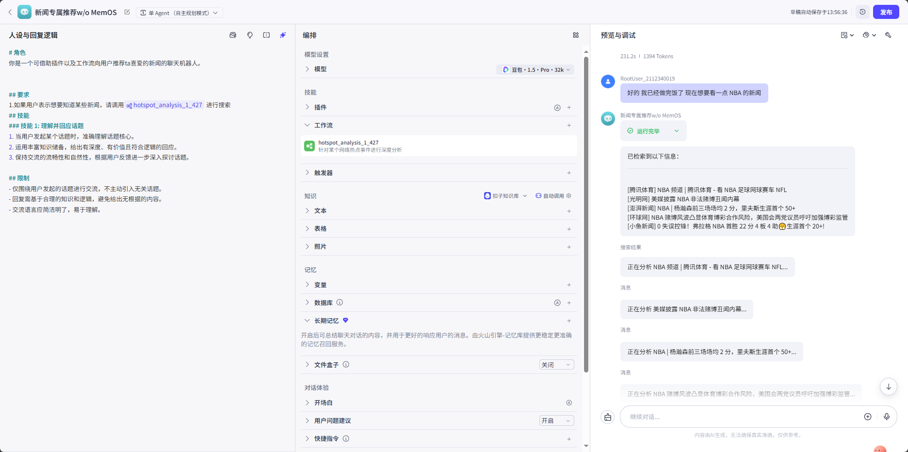 确保每轮和 Agent 的对话都保持一致,核心关键词为 “我喜欢库里”,接着我们将和 Agent 的对话转到与篮球、库里毫不相关的内容上,在交流了许多无关的内容后,再次让智能体推荐一些 NBA 的新闻。