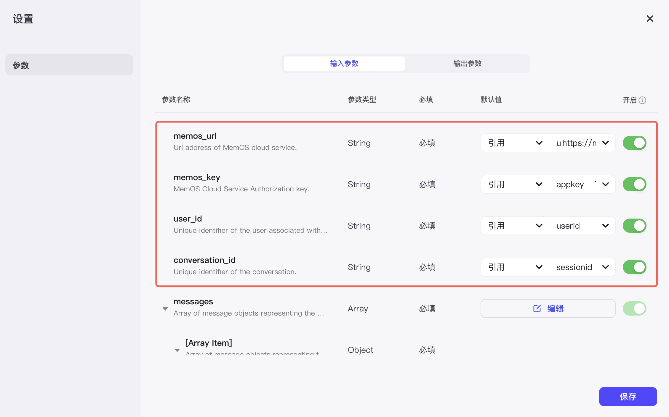 保存后,继续编辑下方的 MemOS 插件 - search_memory,将变量添加/引用到对应位置:
