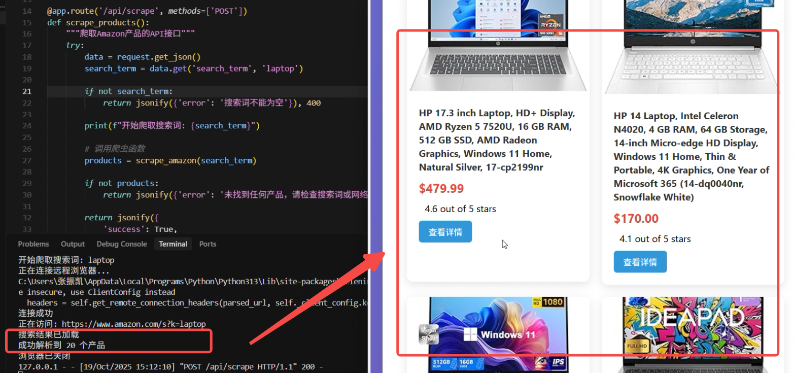 @app.route('/api/scrape', methods=['POST'])def scrape_products(): """爬取Amazon产品的API接口""" try: data = request.get_json() search_term = data.get('search_term', 'laptop') if not search_term: return jsonify({'success': False, 'error': '搜索词不能为空'}), 400 print(f"API: 开始为搜索词 '{search_term}' 爬取数据...") # 调用我们新的数据采集函数 products = scrape_amazon_search_results(search_term) if not products: return jsonify({'success': False, 'error': '未找到任何产品,或爬取失败。请检查搜索词、代理配置或亚马逊页面结构。'}), 404 print(f"API: 成功采集到 {len(products)} 条产品信息。") return jsonify({ 'success': True, 'search_term': search_term, 'count': len(products), 'products': products }) except Exception as e: print(f"API错误: {str(e)}") return jsonify({'success': False, 'error': f'服务器内部错误: {str(e)}'}), 500