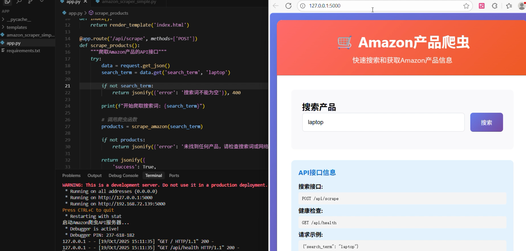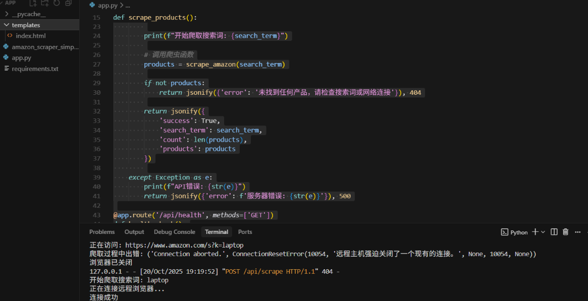 我们将把数据采集核心逻辑放在一个名为amazon_scraper.py的文件中,然后让 Flask 应用去调用它。同时,我们需要一个templates/index.html文件来作为前端界面。