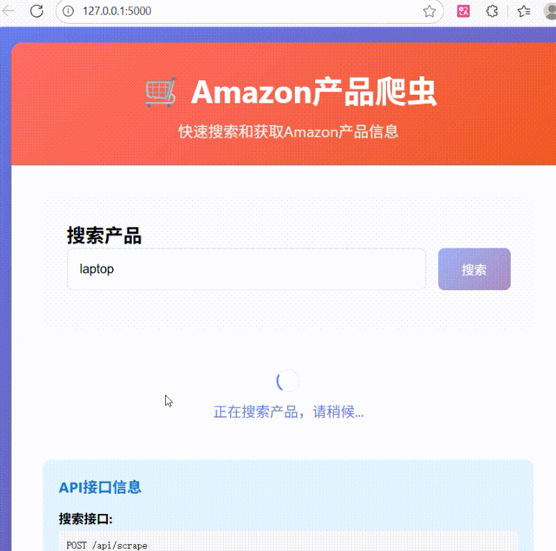 http://127.0.0.1:5000您应该能看到一个搜索界面。输入您想要查询的亚马逊商品名称(例如