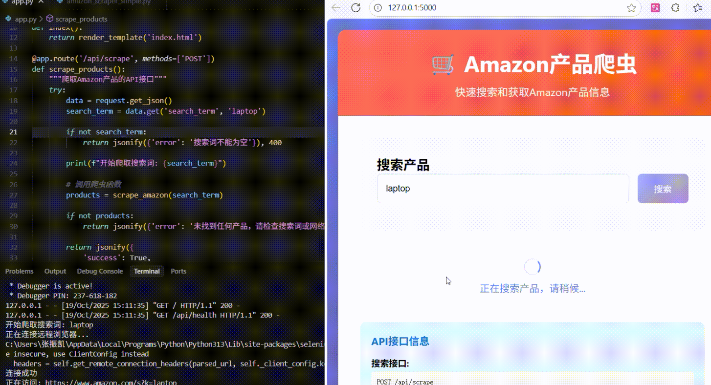 这时,后端 Flask 应用会接收请求,调用 amazon_scraper.py 中的函数,该函数会通过IPIDEA代理启动一个无头 Chrome 浏览器,访问亚马逊并采集数据,最终将结果返回给前端进行展示。