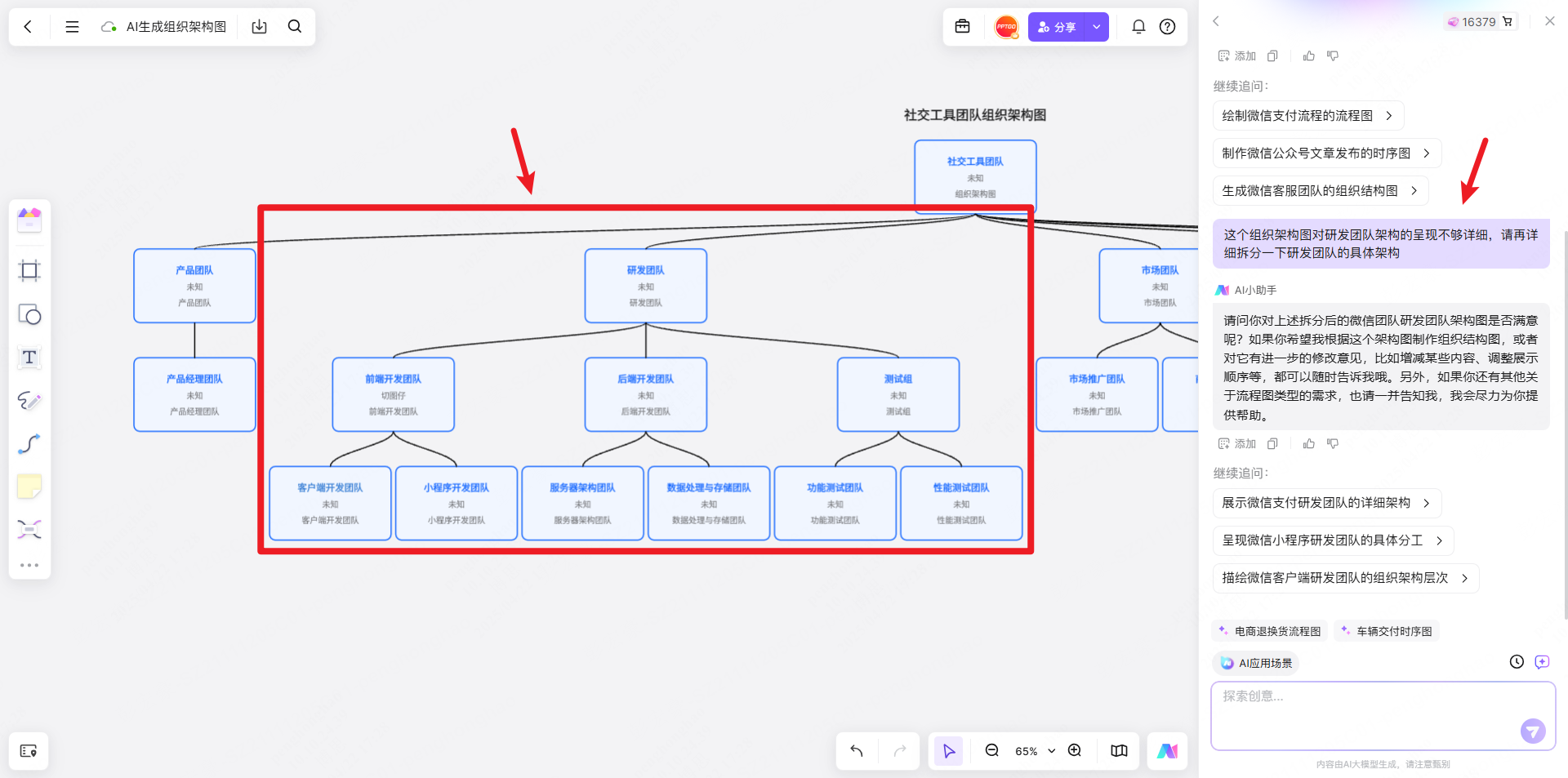 boardmix AI 支持继续追问和多轮对话能力,如果对 AI 生成的第一版组织架构图不满意,可以在输入框中向 boardmix AI 提出自己的需求,譬如“组织架构图对某个部门的呈现不够详细,请再详细拆分一下该部门的具体架构”,让 boardmix AI 进一步细化组织架构图的内容,如下图所示。