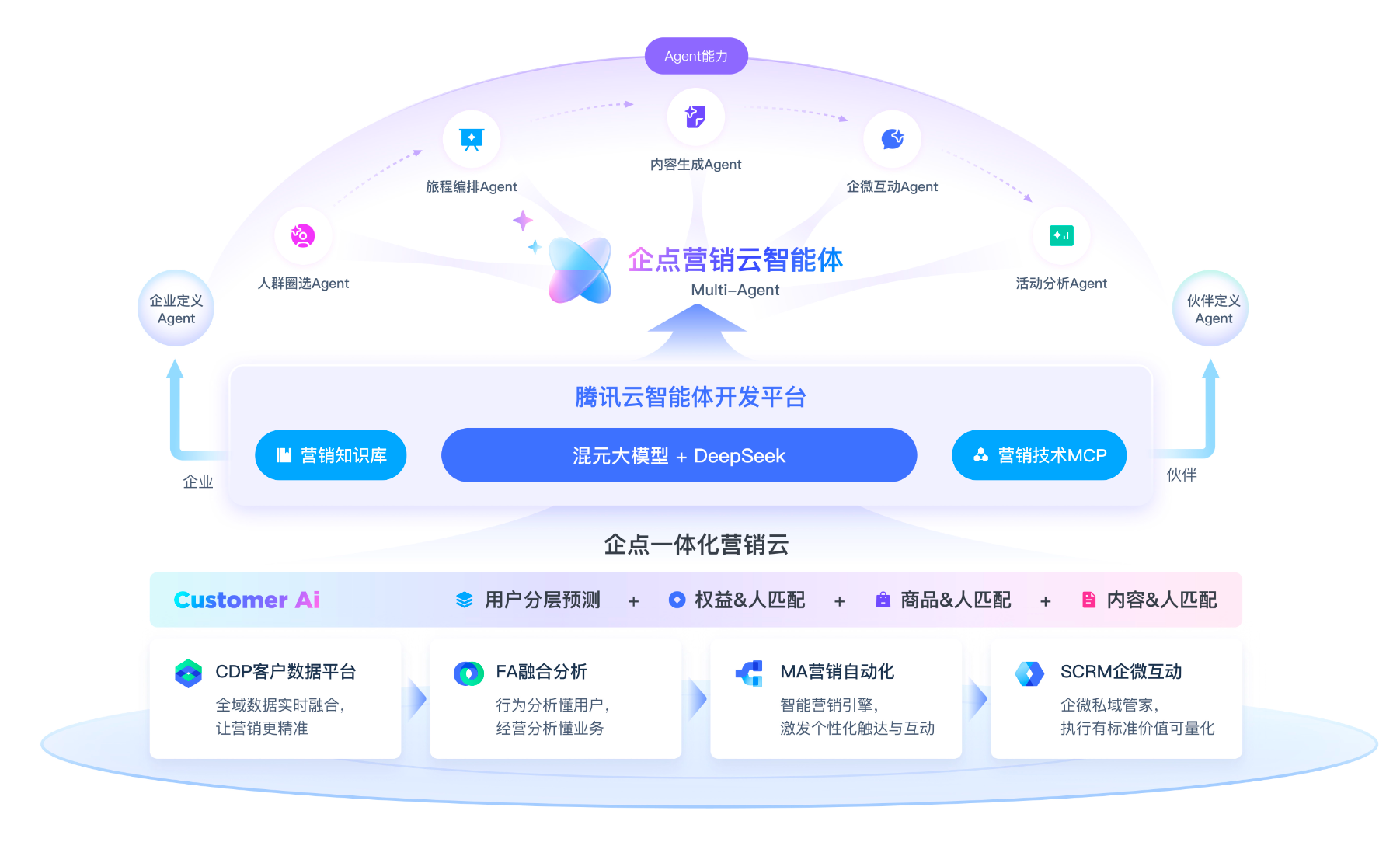 依托腾讯云智能体开发平台与多智能体架构,MAGIC 方法论被落地为“营销云+多智能体”产品矩阵,助力企业打造智能化增长中枢,快速适应 AI 驱动的市场环境。