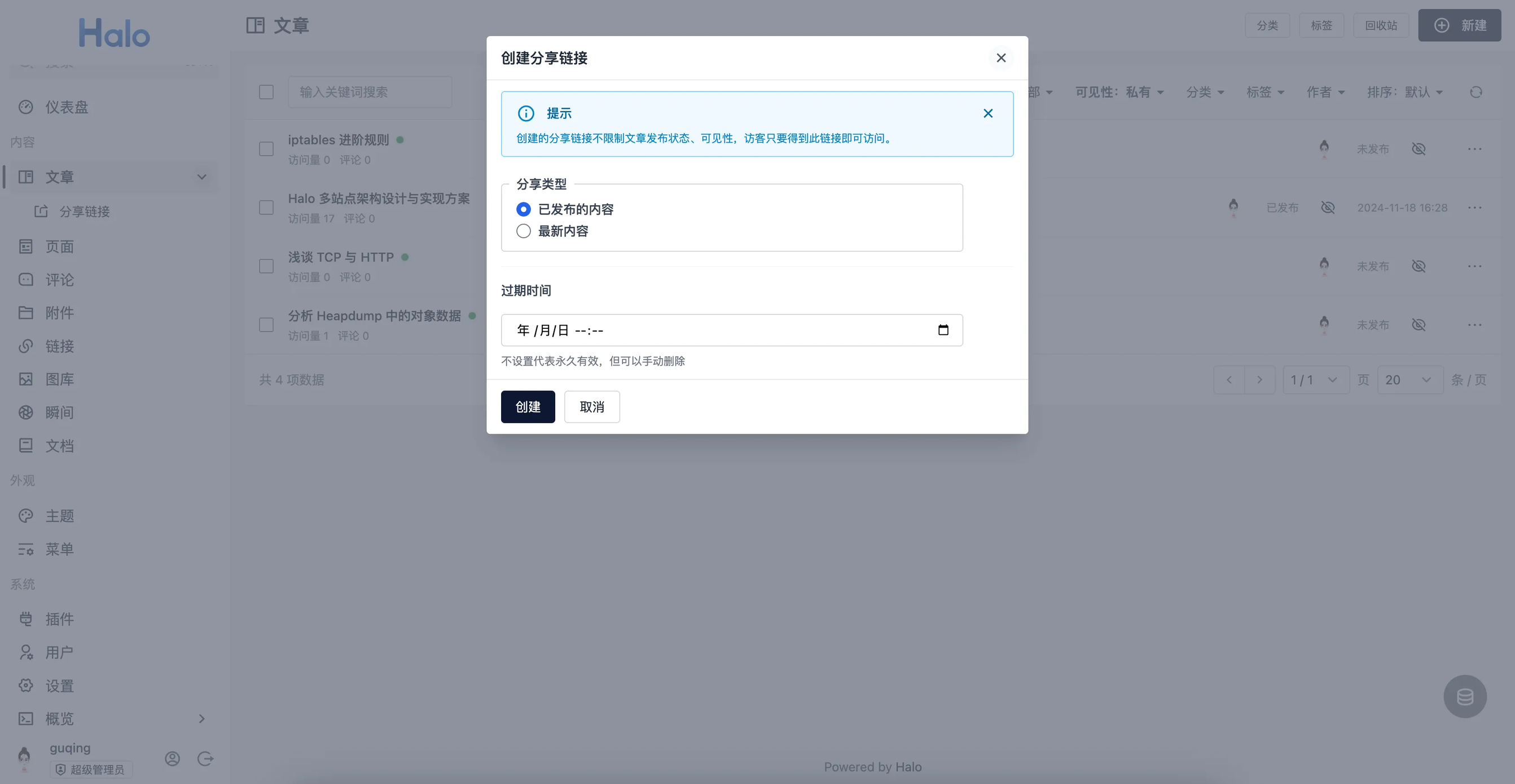在文章列表页面,你可以看到每篇文章的操作菜单中新增了「创建分享链接」选项: