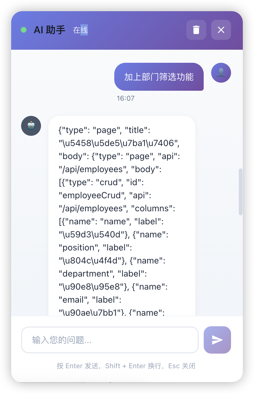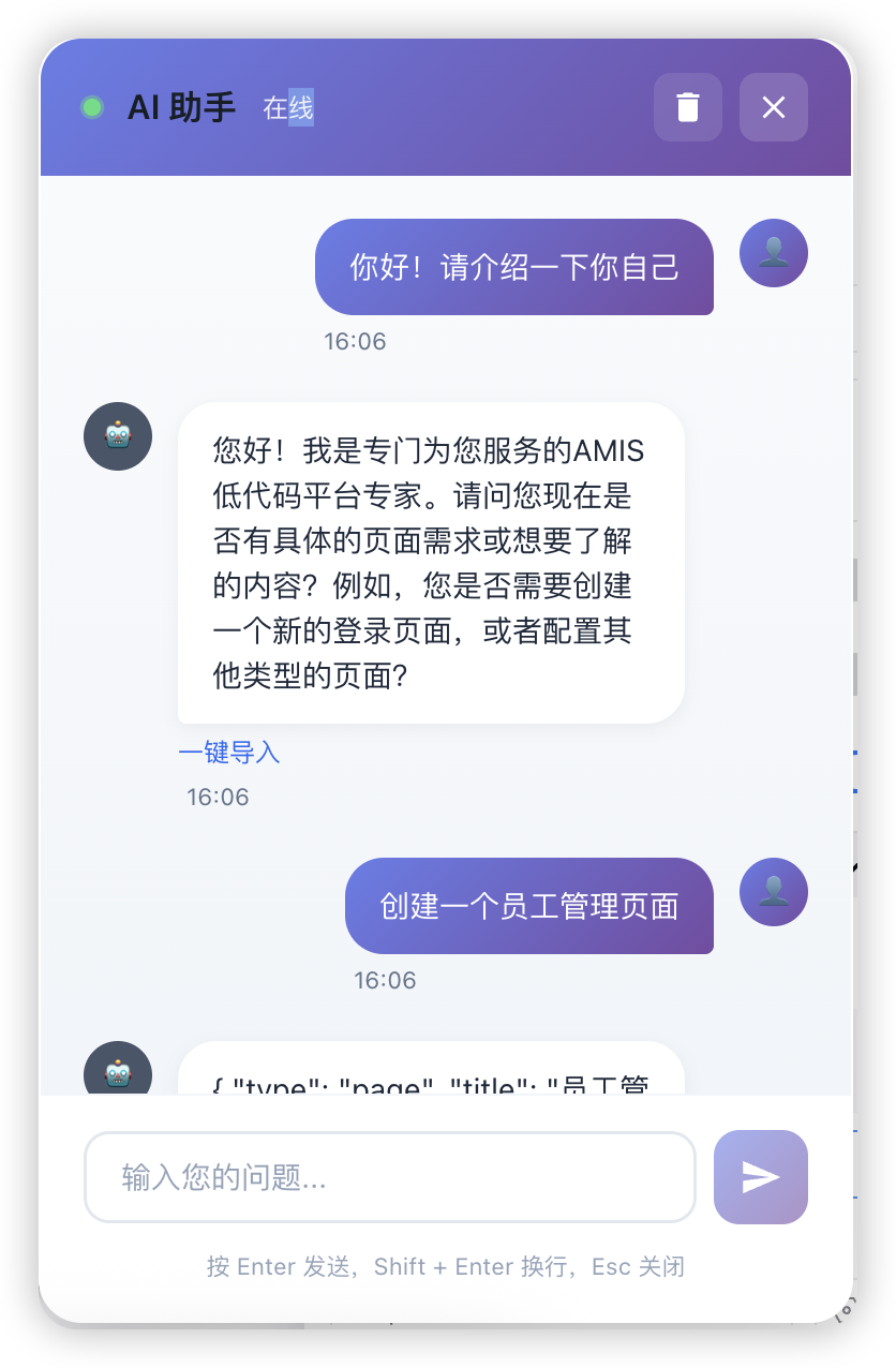在实际应用中,当用户提出“创建一个员工管理页面”的需求后,紧接着说“加上部门筛选功能”,系统能自动理解后者是前者的补充和细化,而非一个独立的新需求。这种连贯的交互体验大大降低了沟通成本,使开发者能够像与人类同事合作一样与智能体进行交流。支持一键导入生成代码功能,用户点击一键导入,前端将 AI 生成页面代码,直接写入低代码平台代码编辑区域,快速写入页面。效果展示: