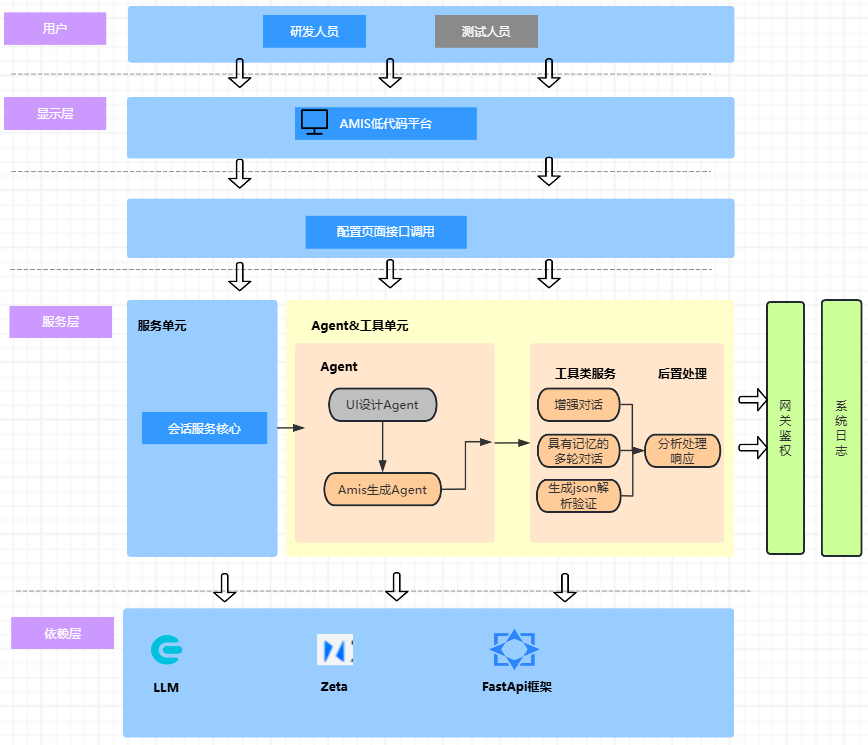 当 AMIS 与 AI 智能体相结合,便形成了一种强大的协同效应。AMIS 提供了灵活的前端应用构建能力,而 AI 智能体则为这些应用注入了智能化能力,使其能够理解用户意图、自动化处理复杂任务。这种融合创造了 1+1>2 的价值,为低代码开发带来了革命性的变化。AMIS 智能小助手的实现可以分为:显示层、服务层和依赖层。显示层负责接收用户需求并以可视化形式呈现结果,核心是 AMIS 渲染引擎;服务层是接入 AI 智能体的核心,包括自然语言理解、任务规划、决策判断等能力;依赖层则是一些底层的依赖服务和框架等。这一架构的核心技术挑战在于如何实现 AI 智能体更精准的生成 JSON 配置页面。为了实现这一目标,则需构建部分工具类来辅助提升 JSON 配置页面的生成精度。