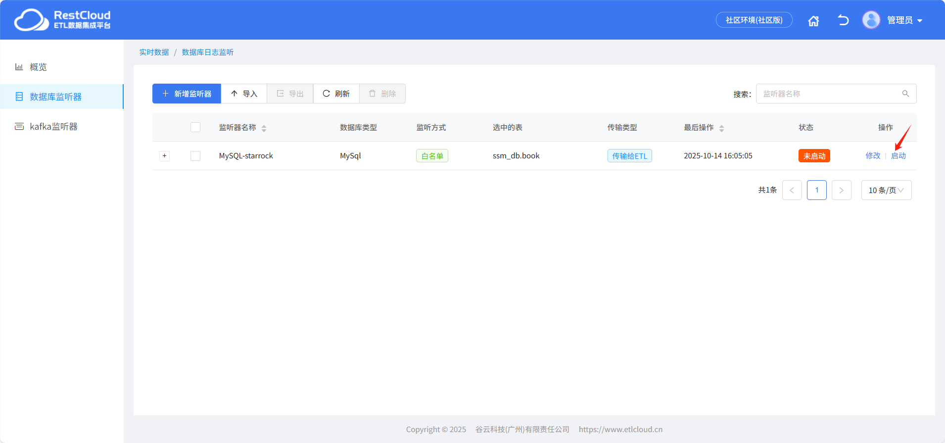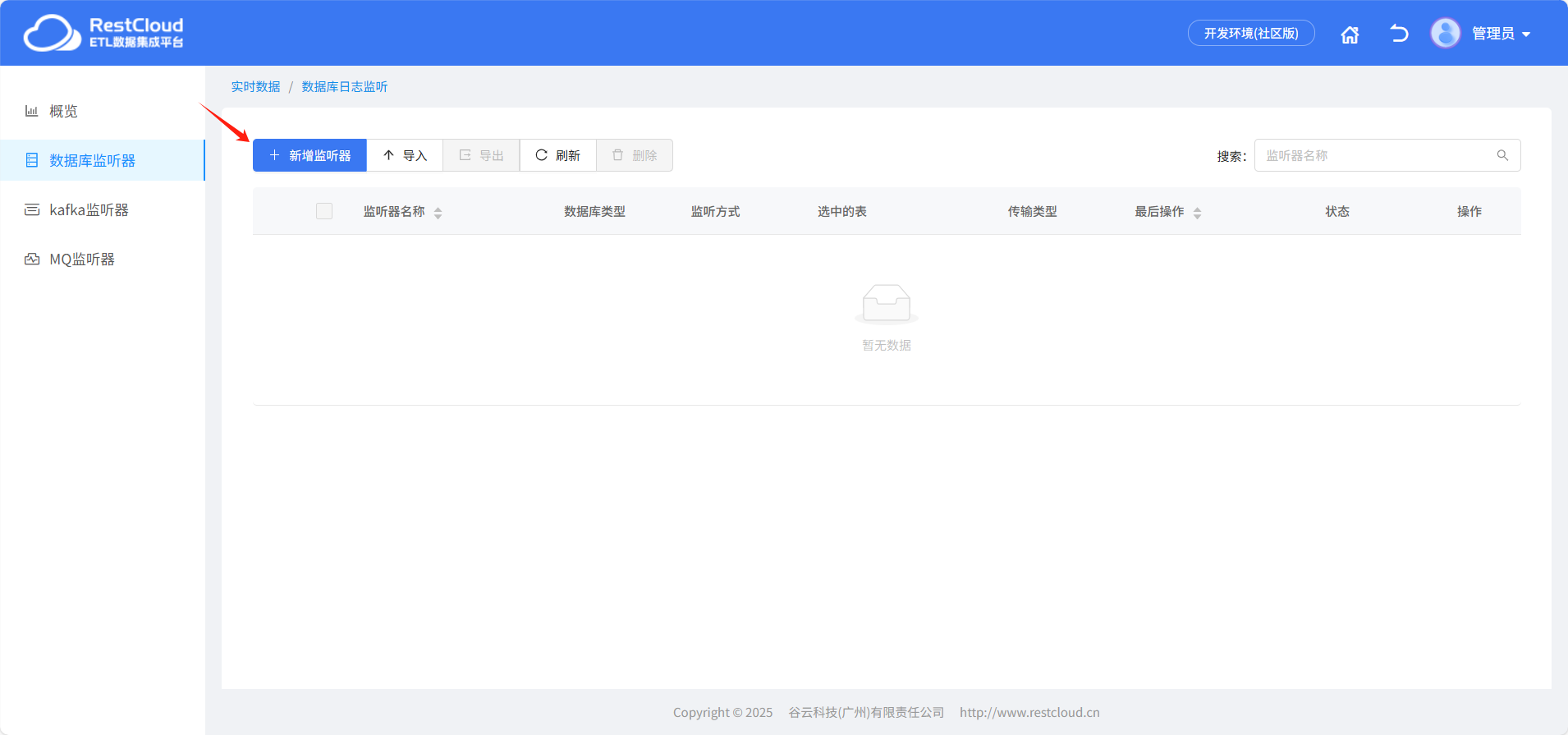 创建好流程后,回到平台首页,进入实时数据集成模块,准备创建数据监听器。