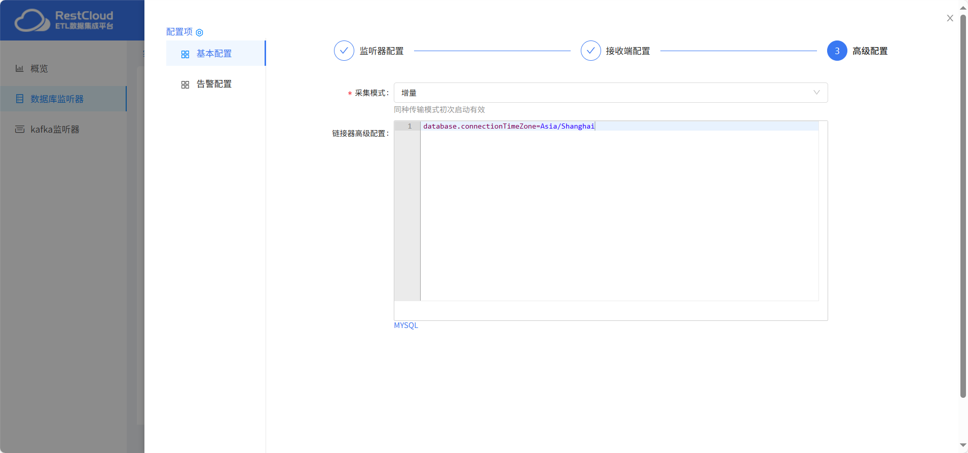 采集模式这里选择增量采集,也有全量+增量的采集模式