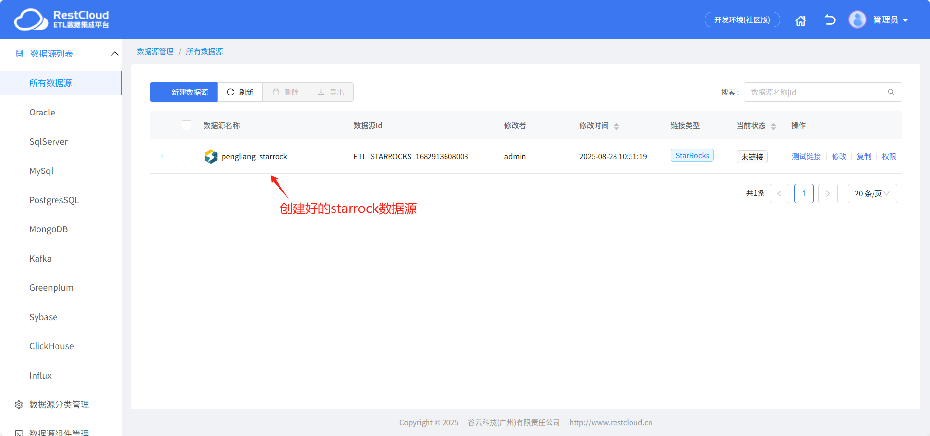 同样的使用 StarRocks 模板创建目标 StarRocks 数据源。