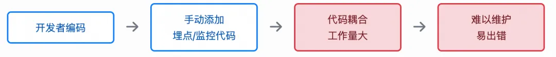 工作量大:对于庞大的应用,手动埋点耗时耗力,且容易遗漏关键的监控点。
