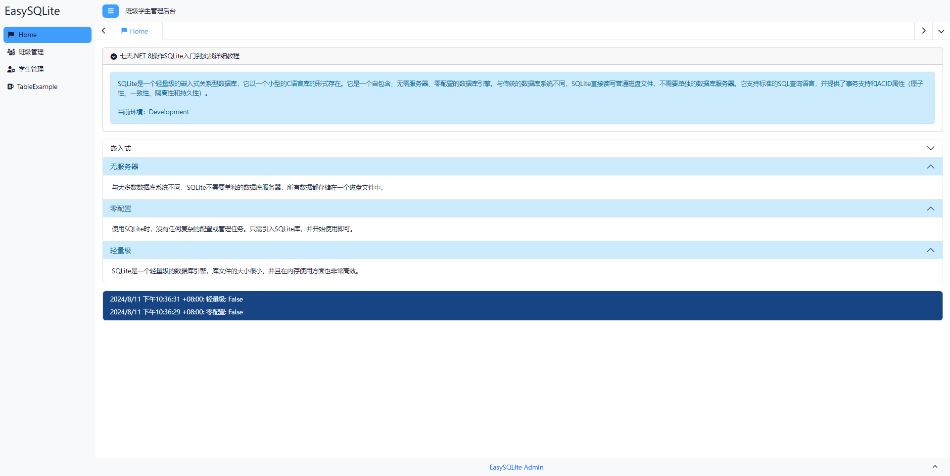 EasySQLite 是一个七天.NET 8 操作 SQLite 入门到实战详细教程,主要是对学校班级,学生信息进行管理维护(包含选型、开发、发布、部署)!