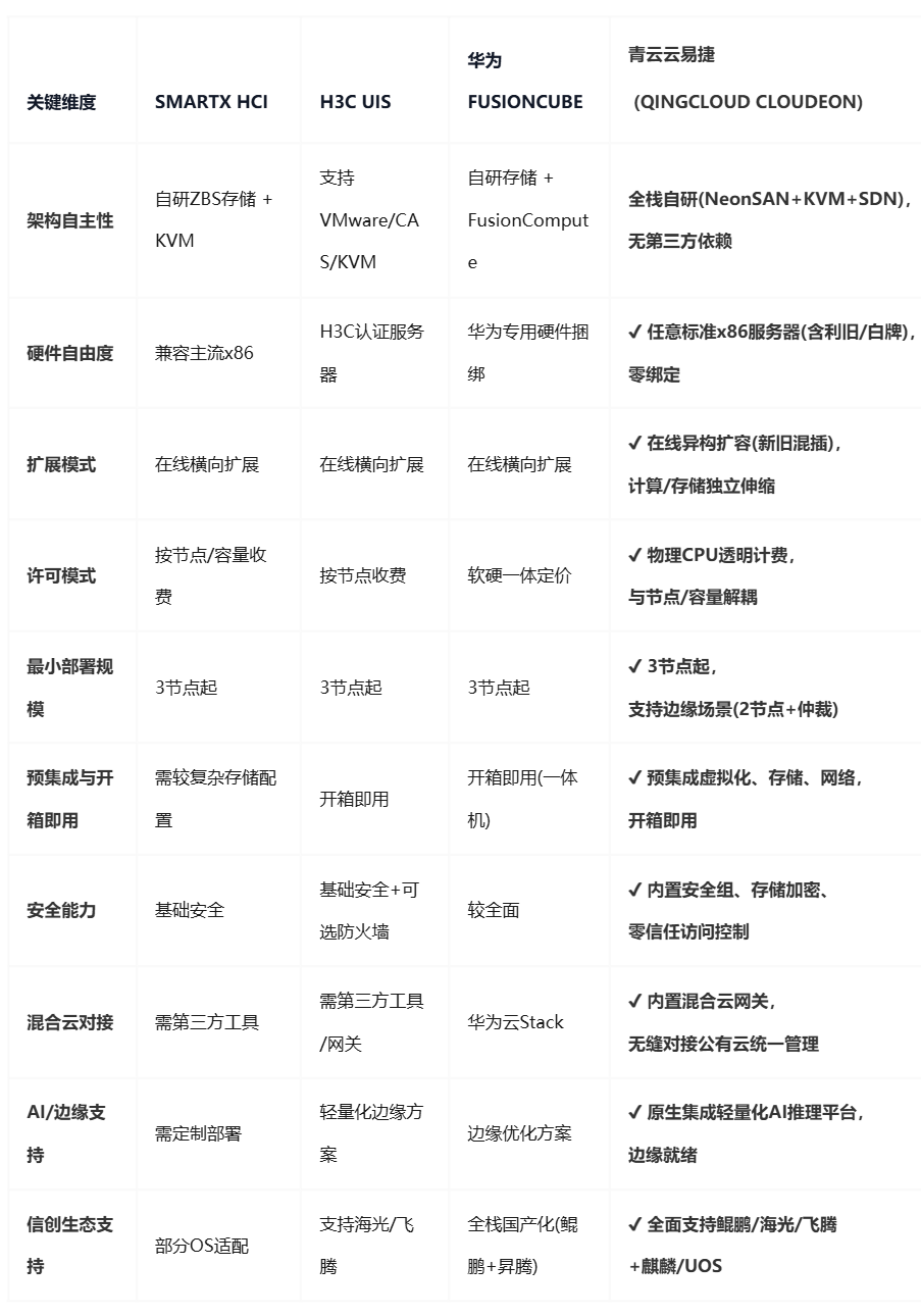 下表清晰呈现了青云云易捷与主流厂商核心方案的差异化优势: