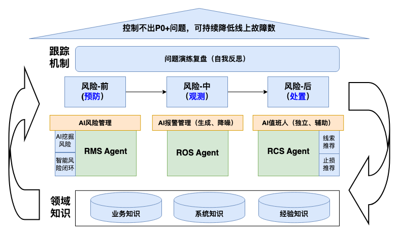 ROS Agent(AI 报警管理):依托领域知识,打造风险实时观测与降噪能力,实现 “应报尽报”。ROS 涵盖知识建设、监控创建、维护、评估、降噪及报警跟进等多个环节,覆盖风险管理(如前置监控完备性建设)与控制(如报警有效性、感知后跟进处置)两个阶段,是问题发现后的主要感知手段。