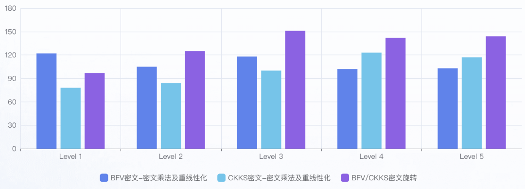 “格物”开发平台搭配高性能 FPGA 加速卡作为核心硬件,优化全同态加密算法复杂计算算子的电路布局和数据通路,提升全同态密文计算任务的计算效率,主要算子加速比超过 100 倍,解决大规模数据在密文态进行运算处理时计算量膨胀过大的难题,全面支持 BFV、CKKS 全同态算法。基于格物硬件加速卡(FPGA)相比纯软的加速倍数,如下图所示。