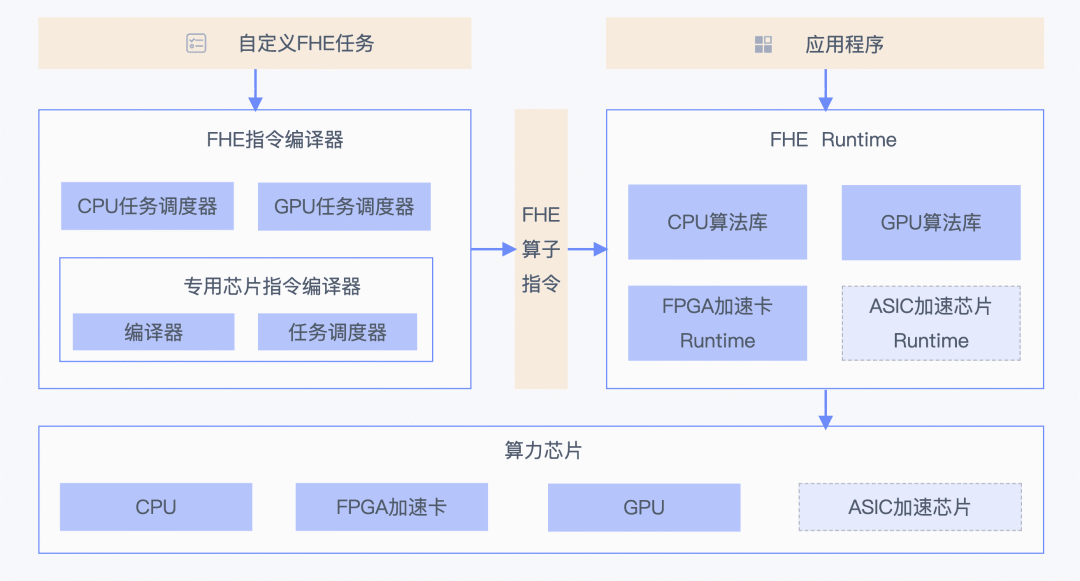支持用户通过统一的 Python 接口定义 FHE 计算任务,并在运行时调用 CPU 或 FPGA 加速卡执行计算任务。