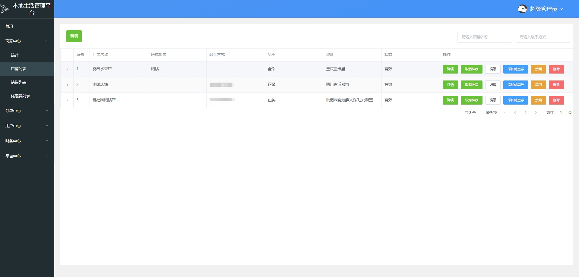 店铺列表:管理商家店铺信息,涵盖店铺创建、编辑、状态监控等操作,实现店铺全生命周期管理。