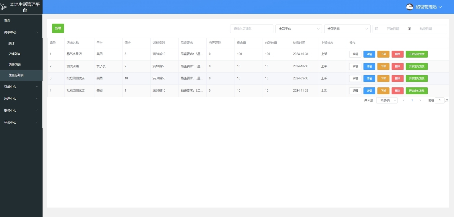 优惠券列表:管理商家发放的优惠券,涉及优惠券创建、编辑、分发、使用情况等,助力商家营销活动开展。