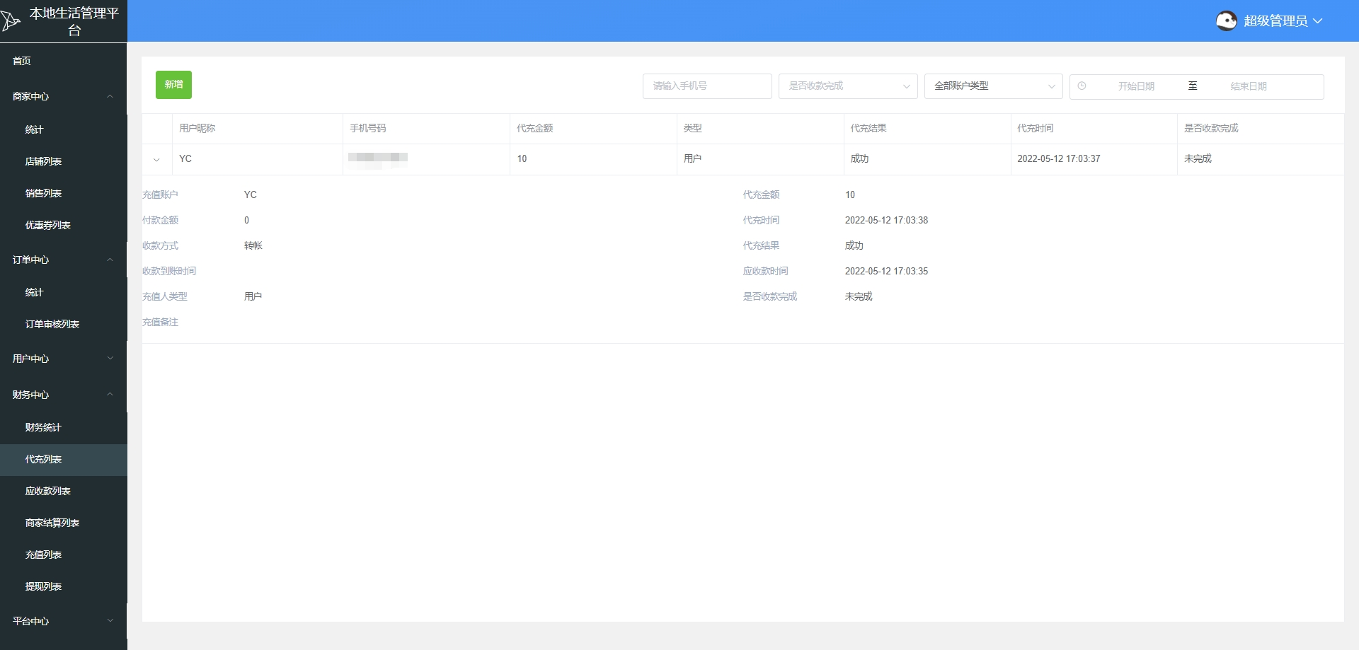 代充列表:管理和跟踪所有代充交易,包含代充请求详细信息(如代充金额、时间、状态及相关用户或商家信息)。
