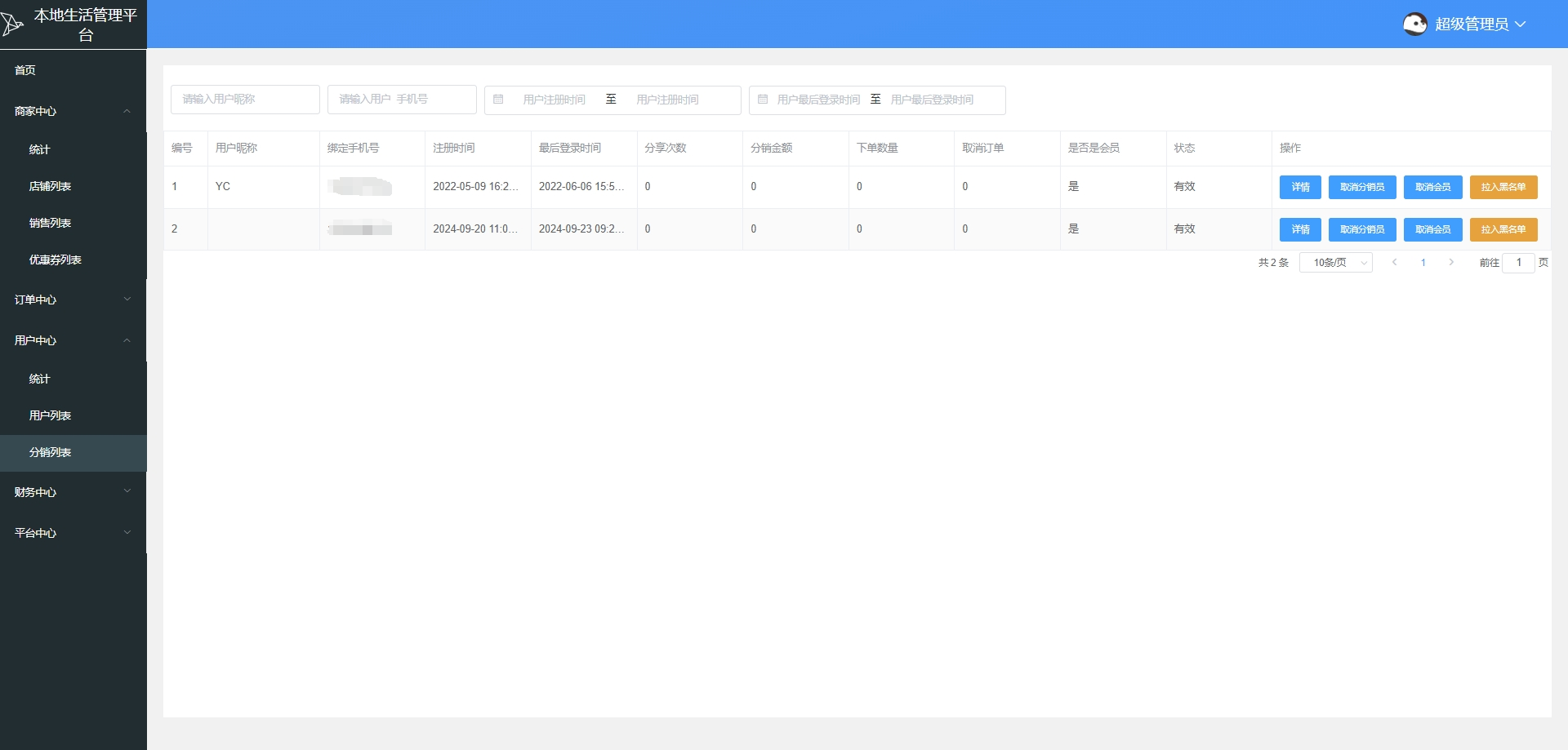 分销列表:管理分销商家信息,包括分销商家注册、业绩、奖励等,推动分销业务的拓展与管理。