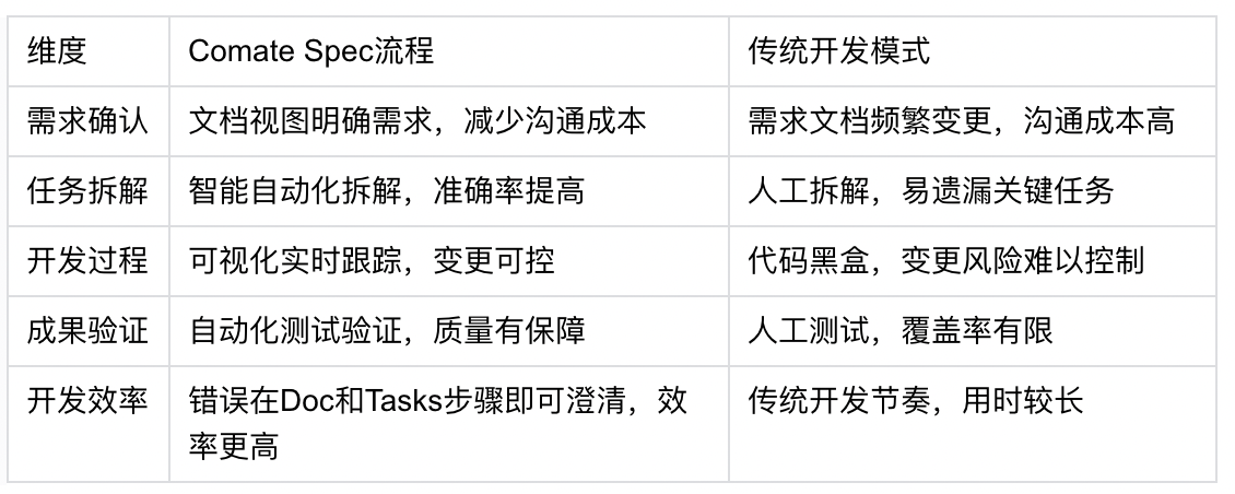 与传统 AI 编程助手直接生成代码不同,Spec 模式要求 AI 先输出实现文档和任务拆解,经过用户确认后才开始编码,从根本上提升了代码生成的准确性和可控性。