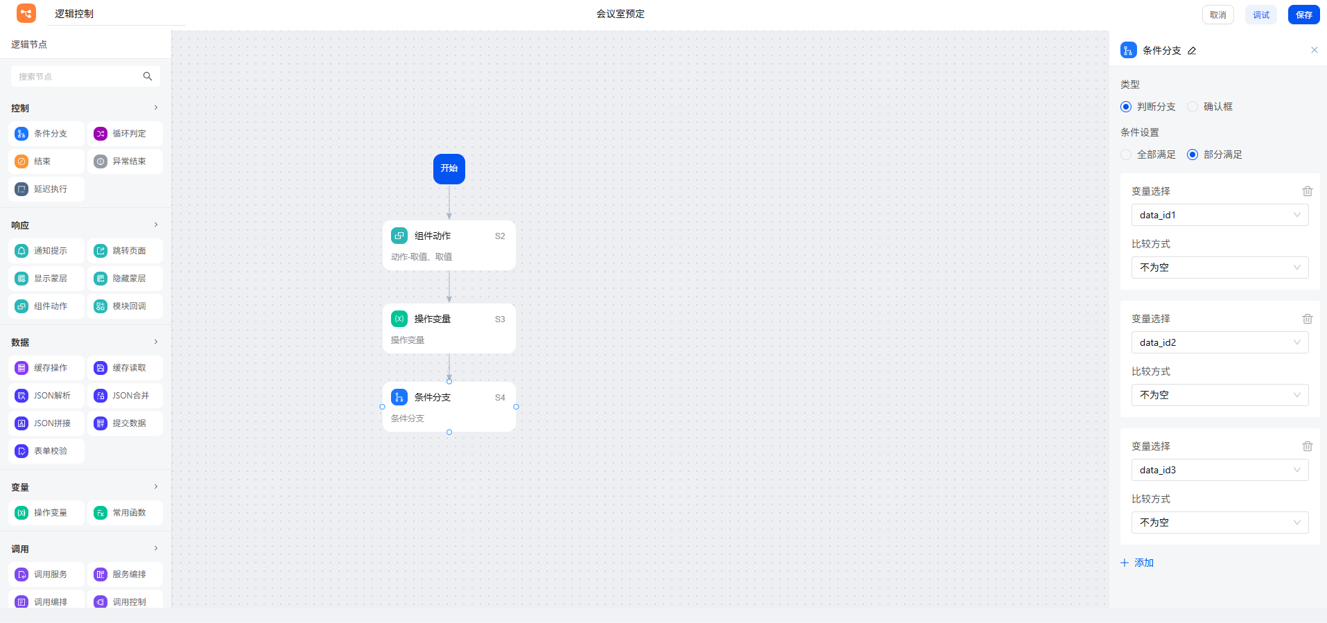接下来,使用“条件分支”节点进行判断:如果以上三种情况中任一查询结果非空,说明会议室已被占用。
